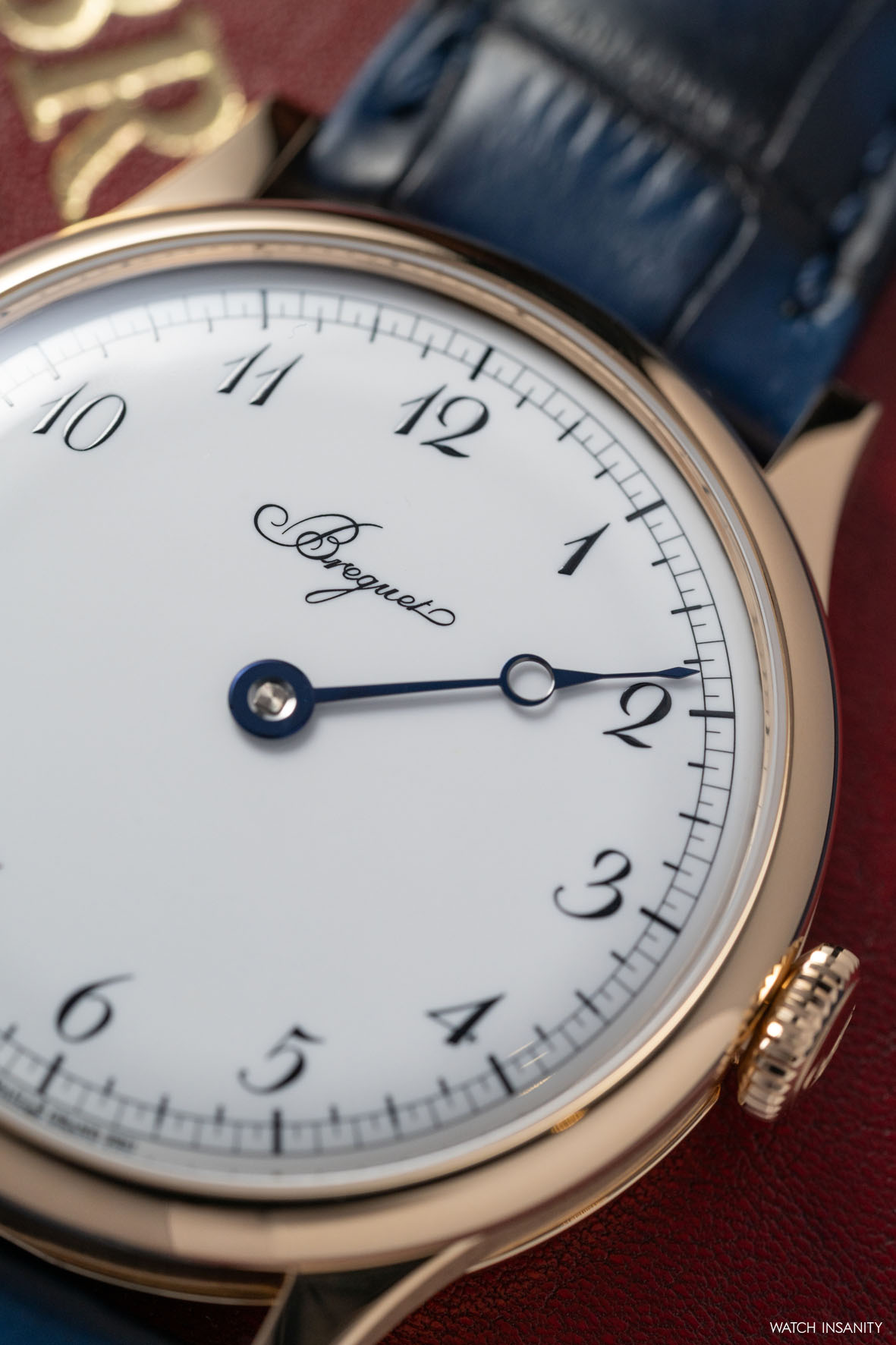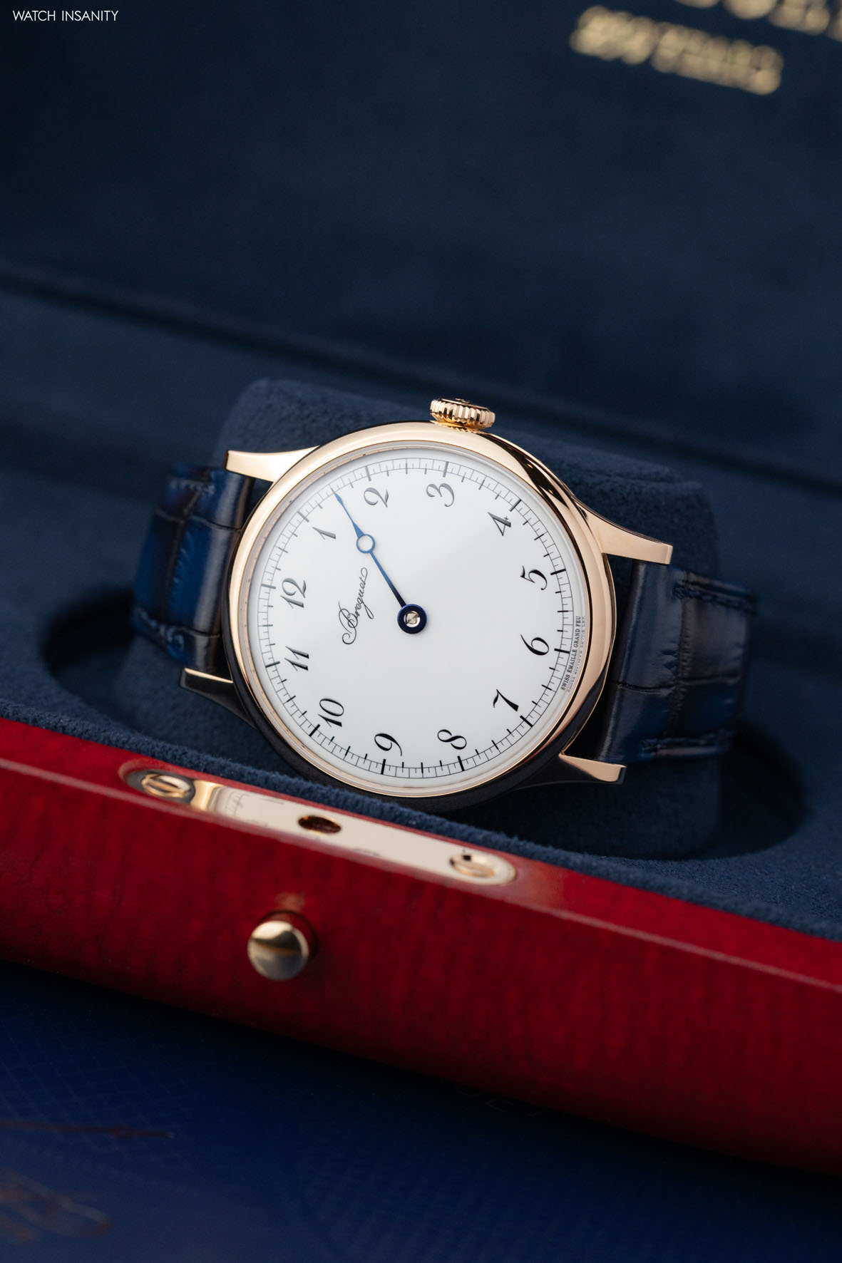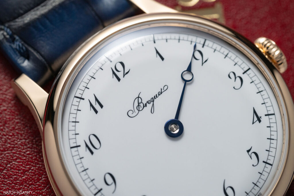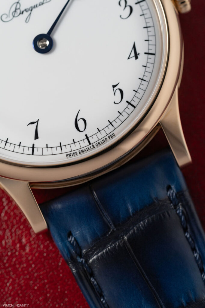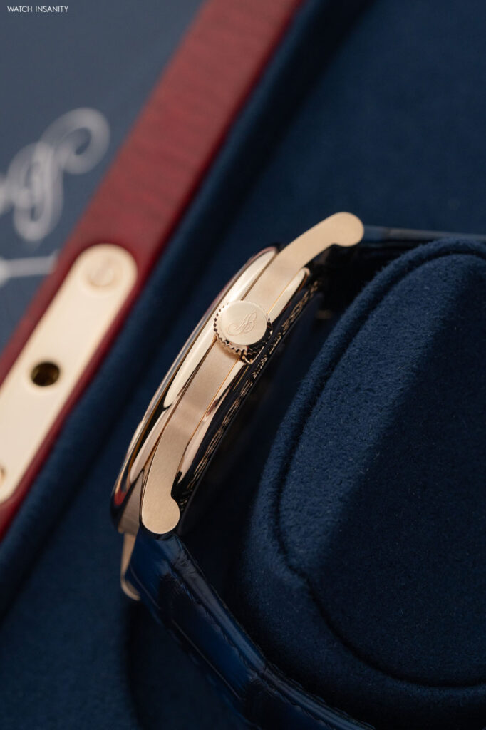 The dial is protected by a sapphire crystal with a so-called ‘chevé‘ profile. The choice of this particular glass is also a tribute to Abraham-Louis Breguet, as he was the first to use it. It is a thinner and less domed glass than those used at the Master’s time; it has a relatively flat surface, gently curved towards the caseband so that it blends harmoniously into the case. For Breguet’s time it was an unprecedented shape, and it entered the contemporary watchmaking vocabulary along with the numerals and hands bearing Abraham-Louis’ surname.