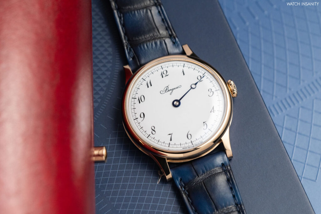 The case houses the new VS00 manufacture calibre with manual winding and 21,600 vibrations per hour, which the company has crafted from gold-plated brass in the same Breguet gold shade. The slightly domed sapphire crystal protecting it allows full vision. If you take the 1797 Souscription and open the caseback cover, you will see that the architecture of that calibre and the current one are virtually identical. The VS00, however, benefits from the most modern technology in terms of materials.