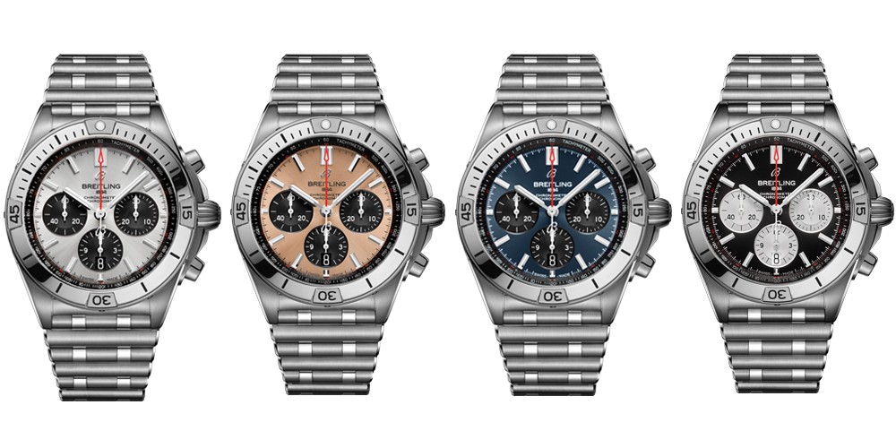 The watches in the Chronomat Collection are available with a range of different metal and dial options. One version of the Chronomat B01 42 has a 42-millimeter stainless-steel case with a choice of a silver, copper, or blue dial with black contrasting chronograph counters. It is also available with a black dial with silver contrasting chronograph counters. Each model is presented on a stainless-steel Rouleaux bracelet with a butterfly clasp.