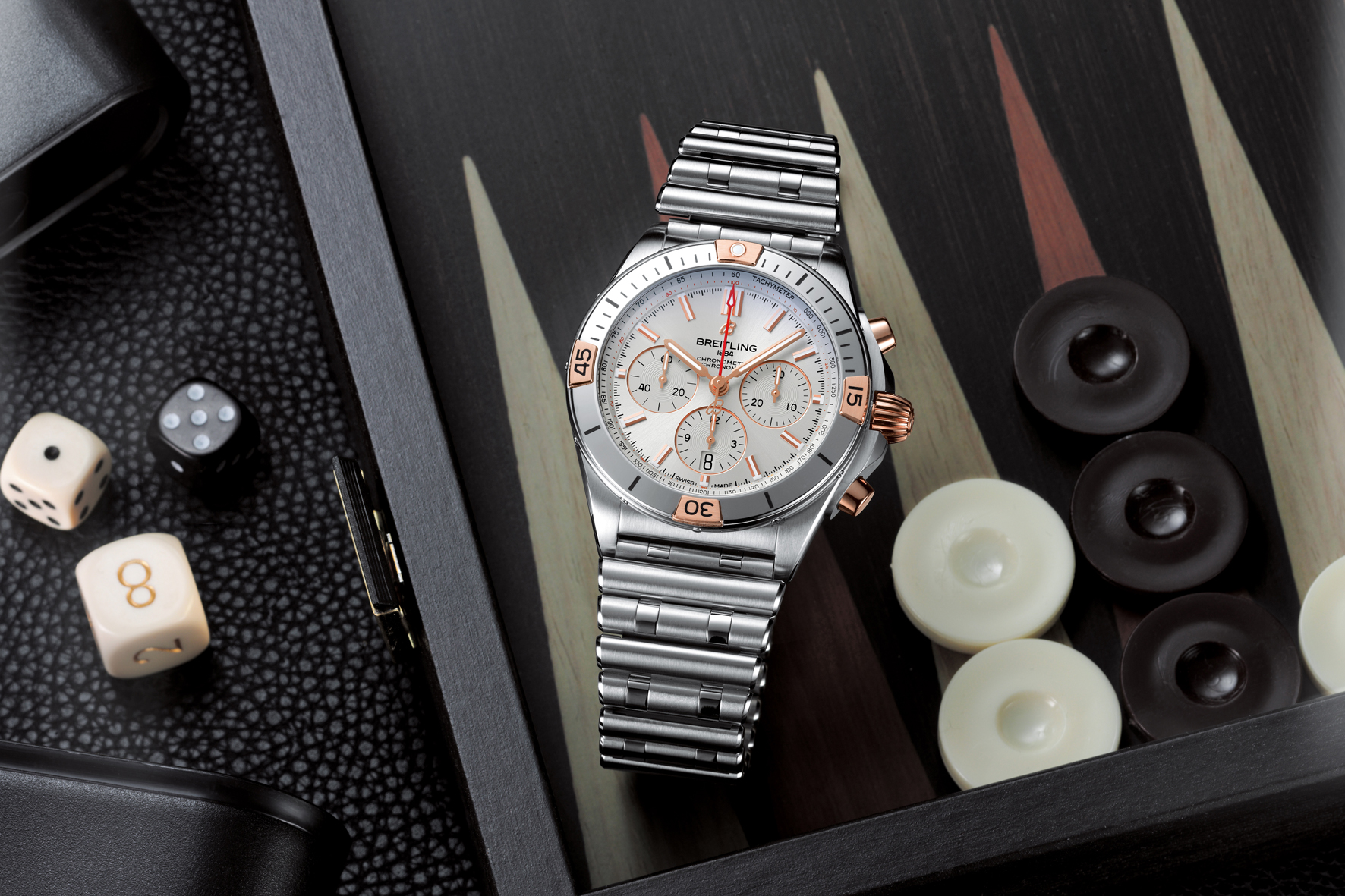 Chronomat enthusiasts looking for an extra touch of luxury will be drawn to the Chronomat B01 42 fitted with an 18 k red gold crown and pushers and a bezel with 18 k red gold rider tabs, numerals, and indexes. This stunning model has a silver dial with silver tone-on-tone subdials and a 42-millimeter stainless-steel case, and is presented on a stainless-steel Rouleaux bracelet with a butterfly clasp.