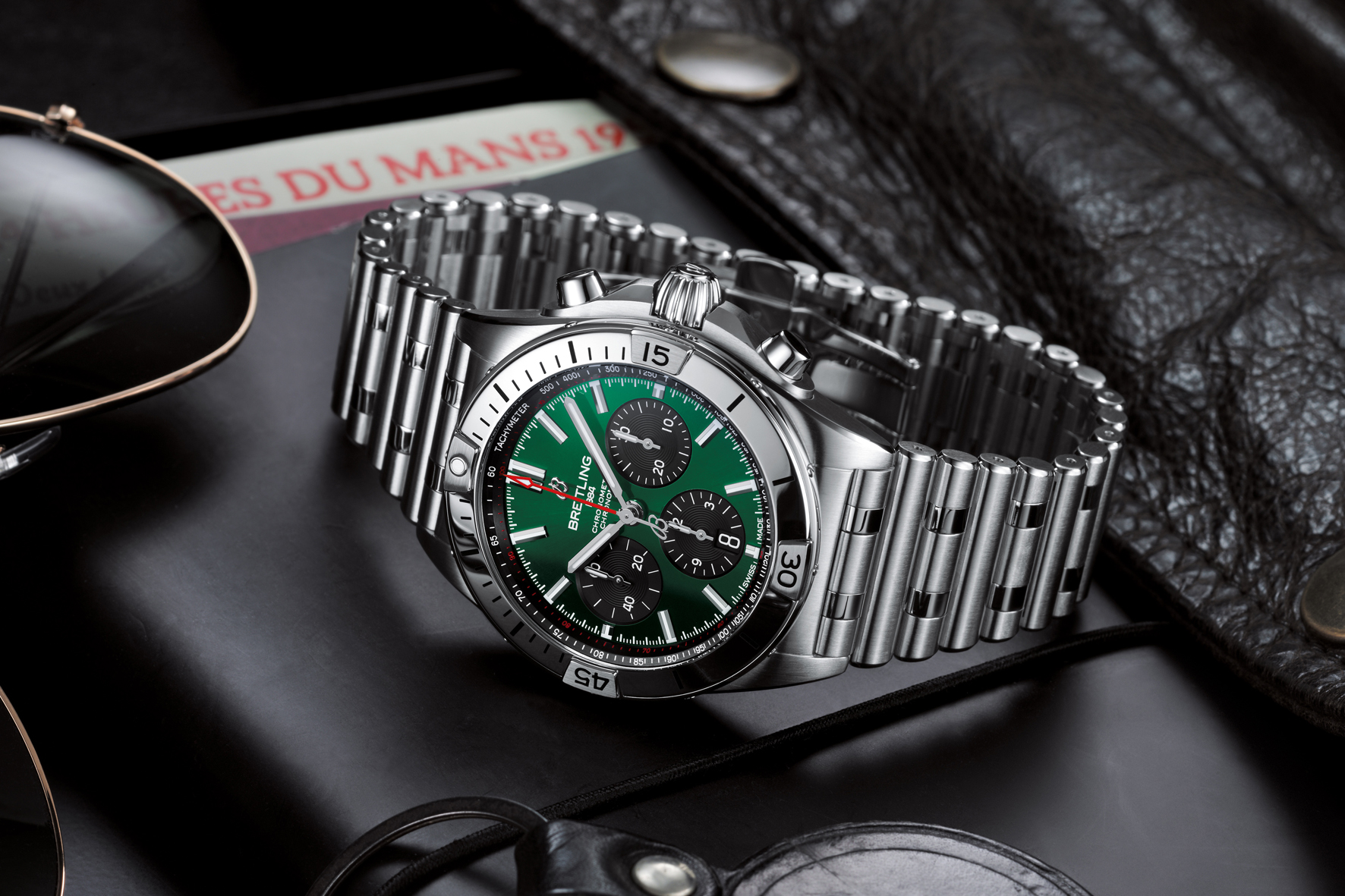 The Chronomat Bentley celebrates Breitling’s partnership with the great British luxury car brand. It has a 42-millimeter stainless-steel case with a green dial and black contrasting chronograph counters. This watch, presented on a stainless-steel Rouleaux bracelet with a butterfly clasp, features a “BENTLEY” engraving around the transparent sapphire caseback.