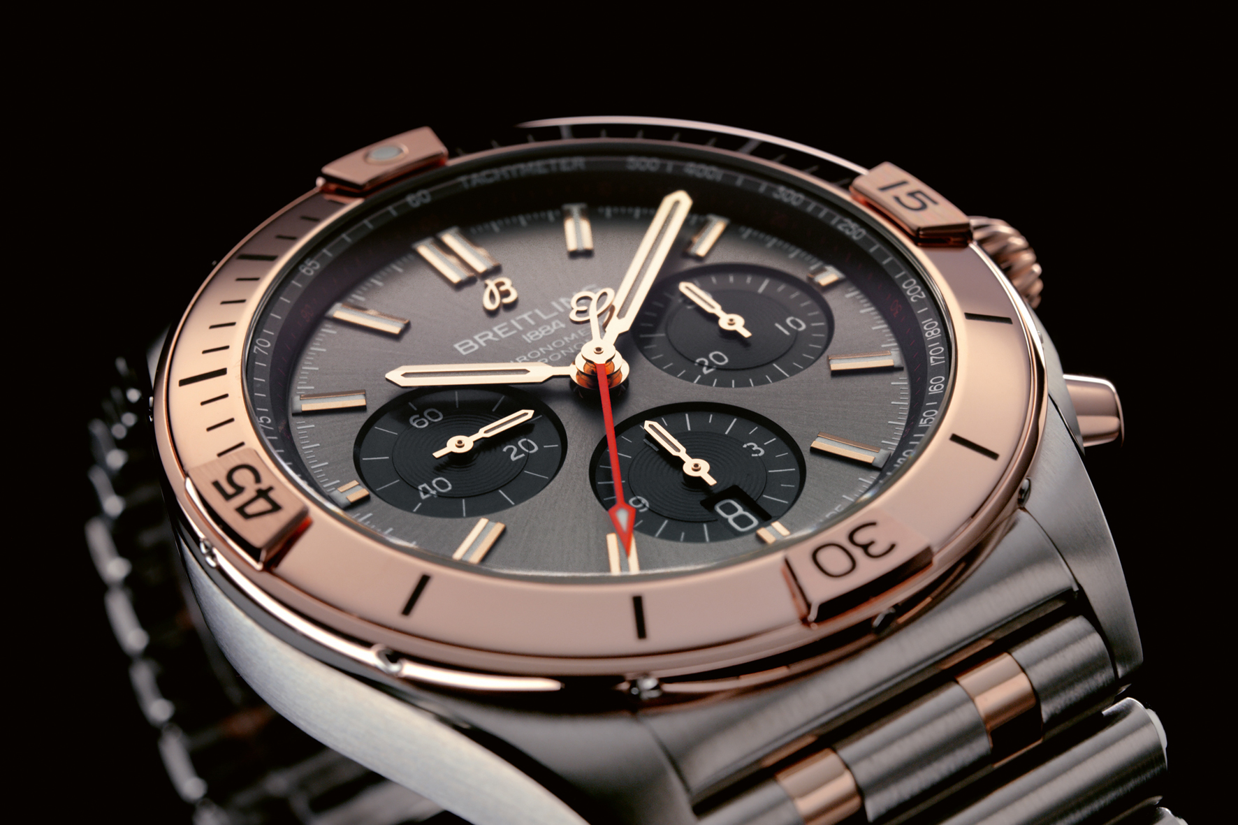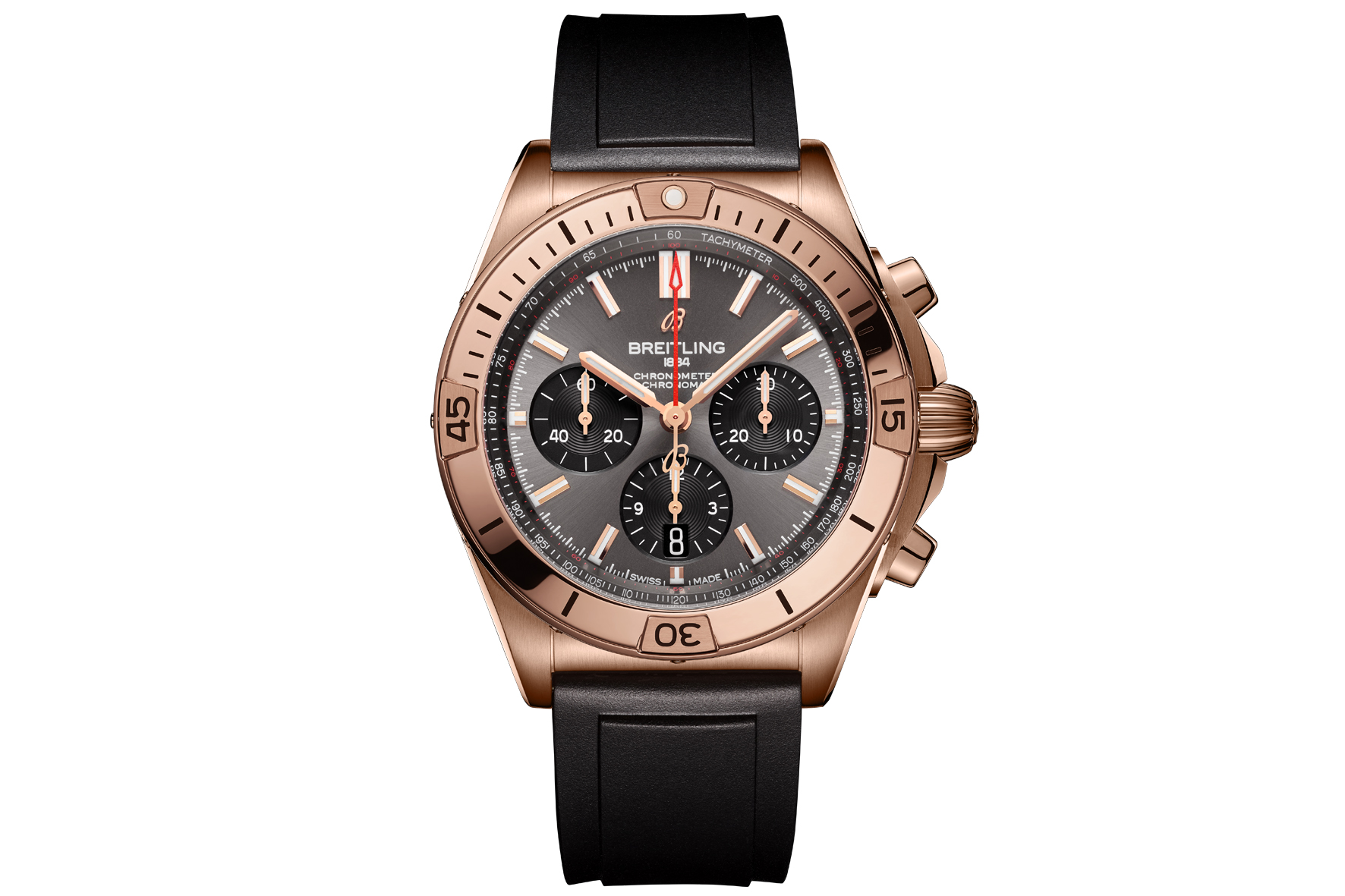 Finally, for someone who wants to take sporty luxury to a whole new level, there is also a Chronomat B01 42 with a striking 18 k red gold case presented on a black rubber strap with an 18 k red gold folding clasp. It has an anthracite dial with black contrasting chronograph counters.