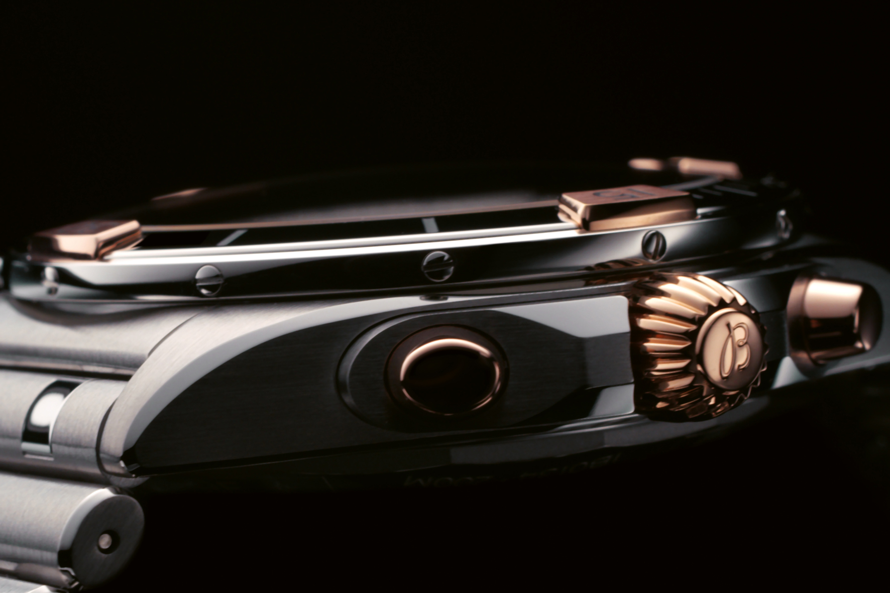 Another striking two-tone Chronomat features either an elegant blue dial with tone-on-tone chronograph counters or an anthracite dial with black contrasting chronograph counters. It is highlighted by an 18 k red gold ratcheted unidirectional rotating bezel and an 18 k red gold crown and pushers. This model is presented on a riveting stainless-steel and 18 k red gold Rouleaux bracelet with a butterfly clasp.