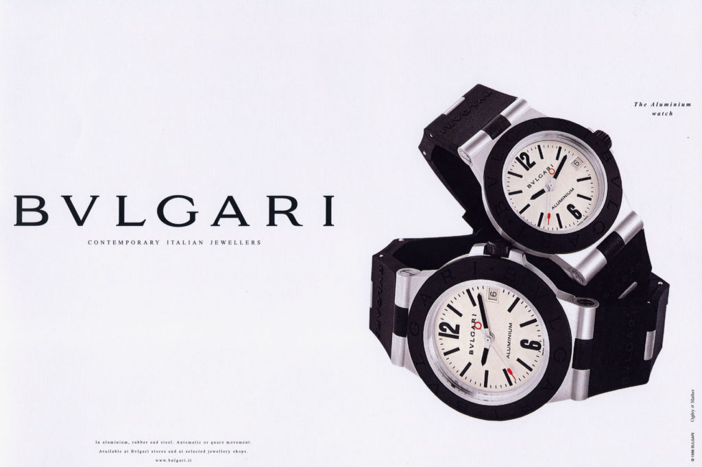 26 October 2020It was 1998 when the Roman Brand presented Bulgari Aluminium, the casual timepiece made of aluminium and rubber, a totally unexpected materials. Out of the box it was not only the watch but also the communication, symbolized by the livery of an Alitalia’s “Jumbo Jet” Boeing 747, which from 1998 to 2000 flew over the skies around the world as a background to the colors of the watch.