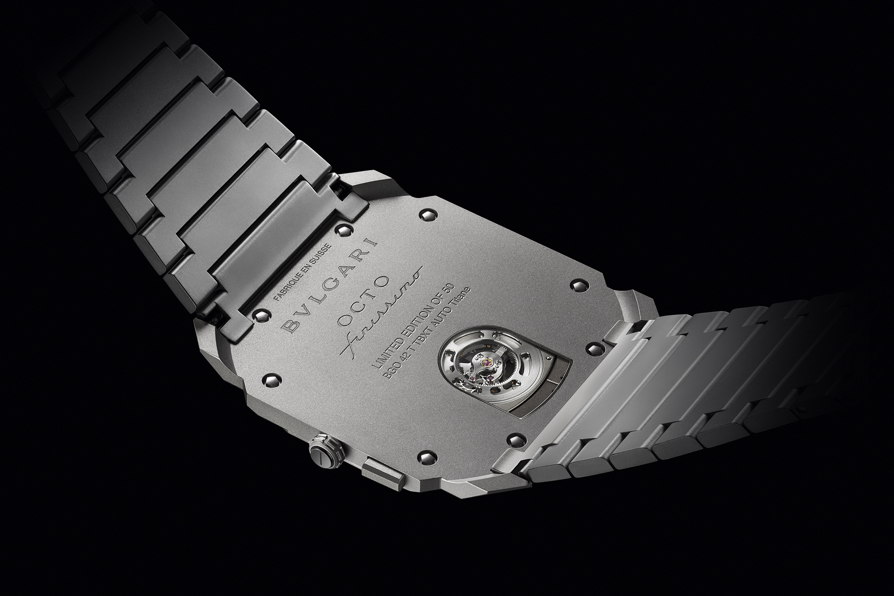 Measuring just 1.95mm thick and endowed with a 52-hour power reserve, Calibre BVL 288 Finissimo is housed in a sandblasted 44 mm titanium case revealing the entirely openworked skeleton movement displaying all its internal organs. Octo Finissimo Automatic Tourbillon also indicates the hours, minutes and small seconds. An opening on the back of the watch, depicting the stylised motif adorning the entrance of the boutique on the Via Condotti in Rome, provides a chance to admire both the tourbillon and the oscillating weight in action.
