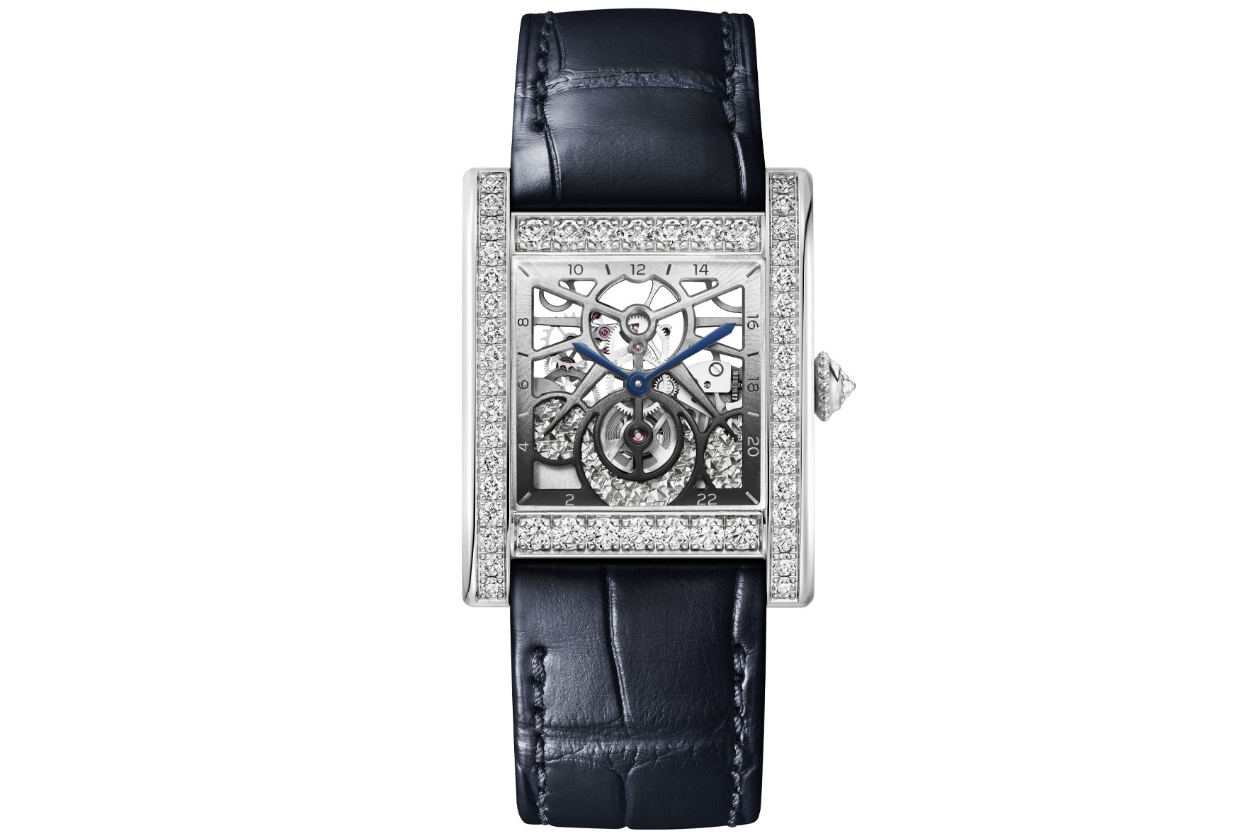 A limited edition of 50 numbered watches, this skeletonised Tank comes in yellow gold on a brown and green alligator strap with a blue sapphire cabochon on the winding crown (€. 71,000) and in platinum on a burgundy and grey alligator strap with a ruby cabochon on the winding crown (€. 80,000). A watch with a case set with brilliant-cut diamonds completes the ensemble, in a limited edition of 20 numbered pieces, featuring alligator straps in two shades of blue with a brilliant-cut diamond on the winding crown (€. 107,000).