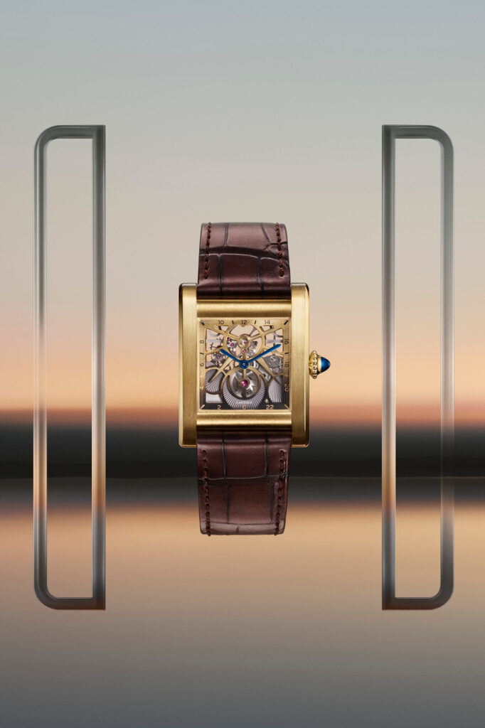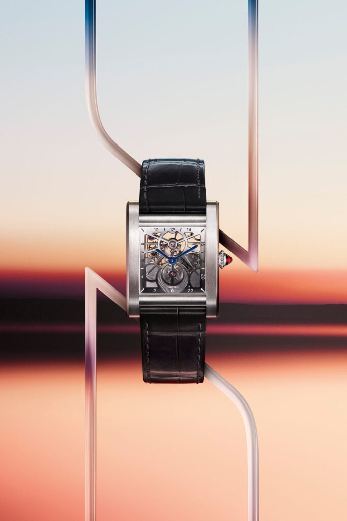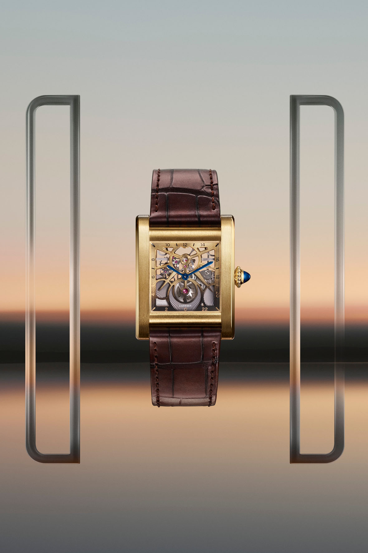 To this iconic shape in the Maison’s watchmaking history, Cartier adds one of its signature complications with a skeleton movement. It also features a 24-hour complication marked by a sun and crescent moon, also skeletonised. While the minute hand turns around the dial in one hour, the hour hand goes round in 24 hours instead of 12 hours. As a result, daytime hours appear on the upper part of the dial and night-time hours appear on the lower part. To symbolise the transition from day to night, watchmakers have coated the skeletonised bridges with a gradation of shades adorning the two halves of the dial.