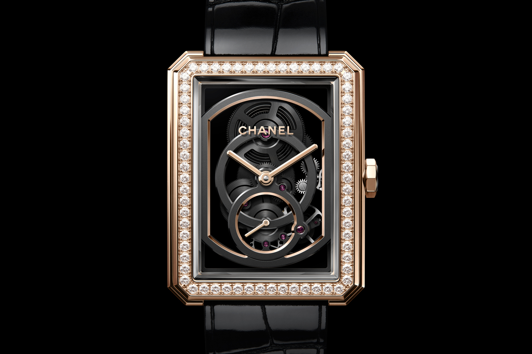 In Chanel’s Boyfriend Skeleton watch the Calibre 3 is hosted in the trademark bold octagon case that distinguishes all Boy-friend watches. The black coating of ADLC (Amorphous Diamond-Like Carbon) on its plates and bridges gives the design even more depth as it plays off the metallic beige gold details on the chamfers and lower circular plate.