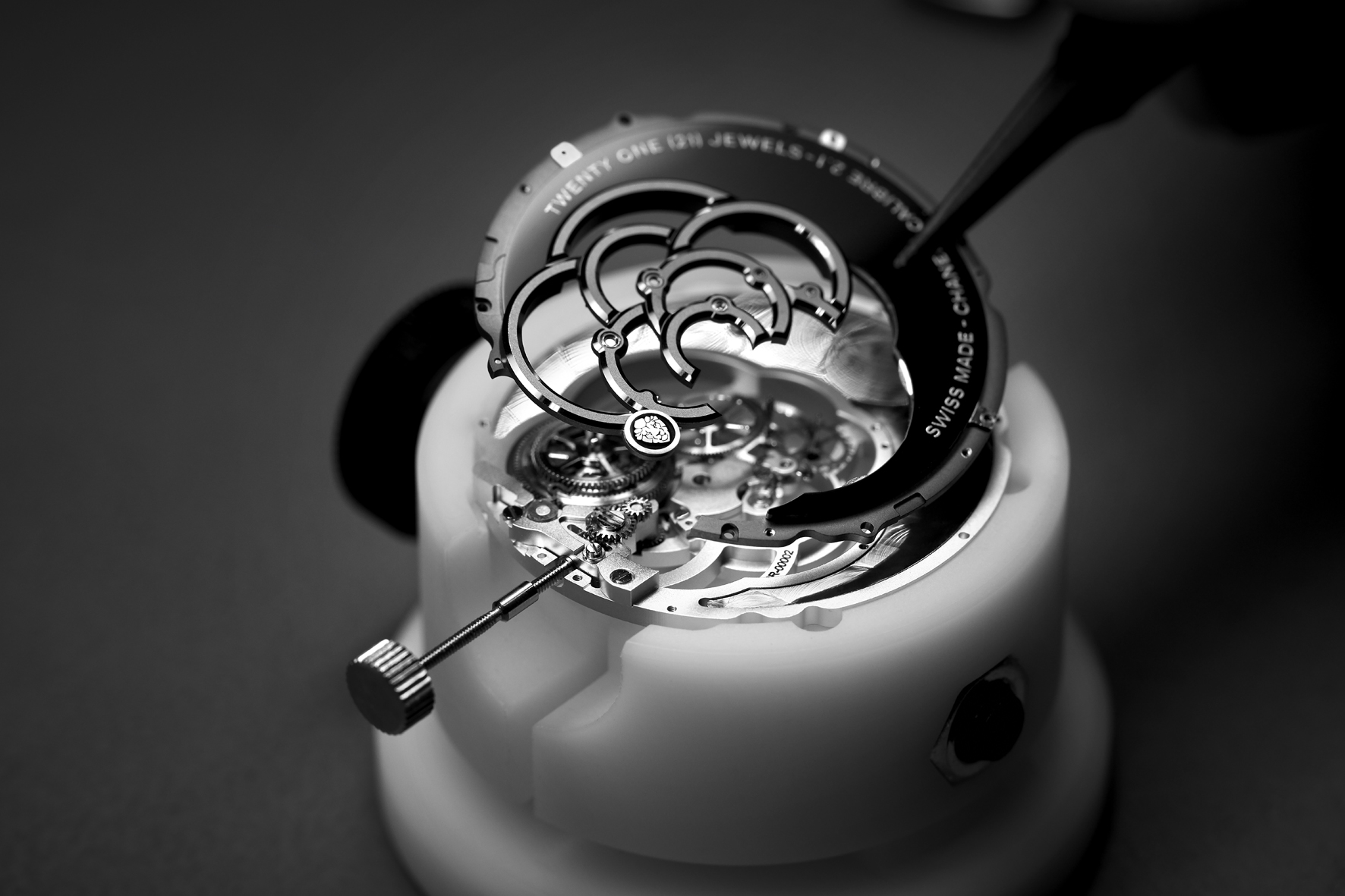 For 2018, Chanel presents for the first time a Mademoiselle Privé watch fitted with a Fine Watchmaking movement, the Calibre 2 originally created for the 30th anniversary of the Première watch. This time the movement returns in its Calibre 2.1 Camélia Skeleton version with a round mainplate. It is a hand-wound, in-house mechanical movement with a 48-hour power reserve and a 4Hz frequency. With its ethereal geometry tracing a Camellia flower, this movement was drawn and designed in-house by the Chanel Watchmaking Creative Studio and developed and assembled by the Chanel manufacture in Switzerland.