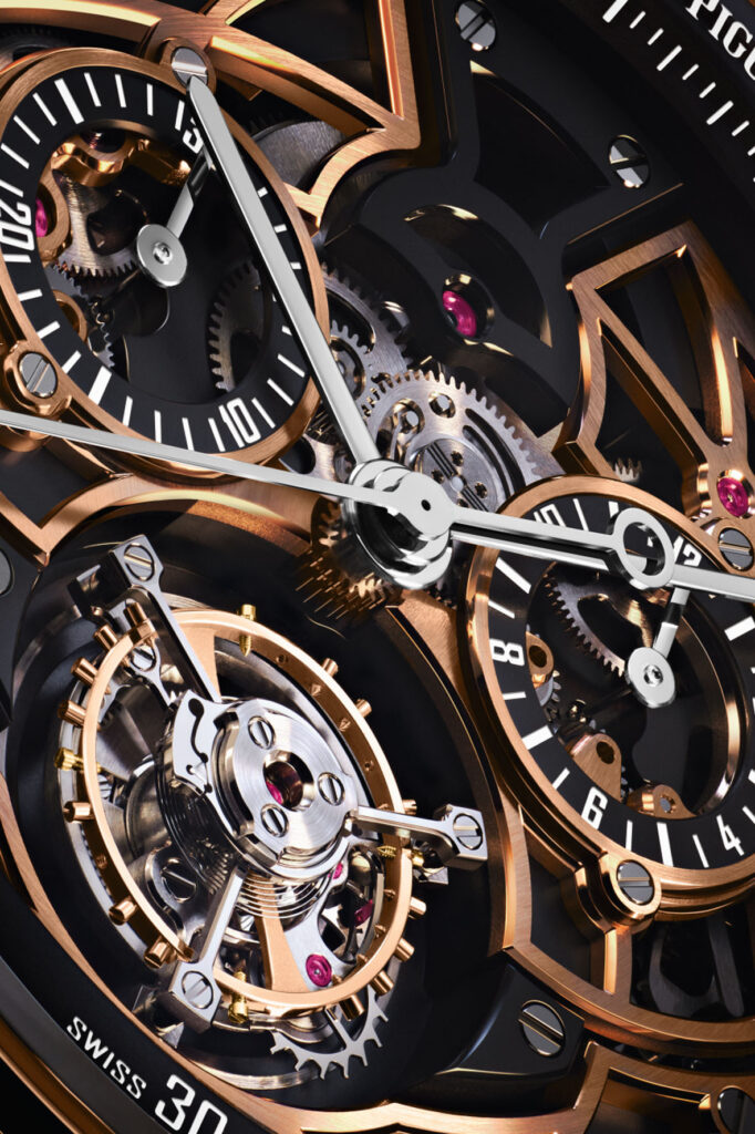 Echoing the two-tone case, the movement is comprised of openworked bridges in both black and pink-gold tones, matching with the pink gold-toned balance wheel. The 18-carat white gold hands bring light into the heart of the movement, while the bridges and decorative elements feature 111 V-angles that have been sandblasted, satin-finished and polished by hand. The decoration of the movement alone represents over 70 hours of work.