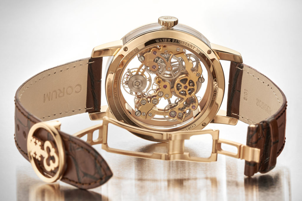 Two years later, Corum unleashes the LAB 02. Its caliber CO 300 consists of an impressive 416 individual components, each meticulously skeletonized and finely finished. Each piece is hand assembled in a unique format with a flying tourbillon at 6, with flying wheels that track the hours, minutes and seconds, and with the bridge set directly onto the mainplate.