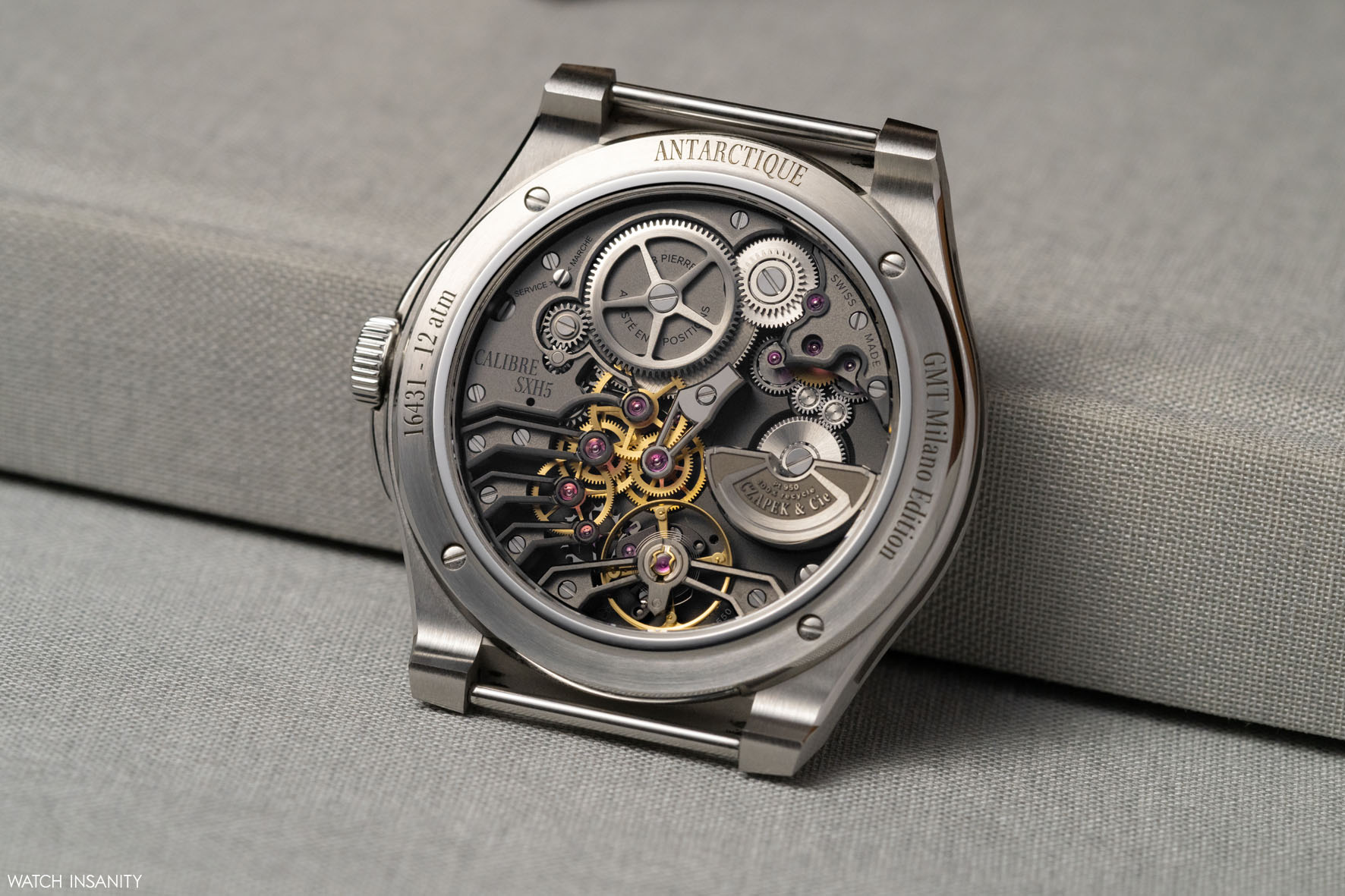 The case back is in sapphire crystal, which leaves the movement completely visible thanks to a very thin recessed ring. On the perimeter of the case back, in addition to the water resistance indication (12 bar), the words GMT Milano Edition and Antarctique are engraved. The bracelet’s quick-release mechanism can be easily accessed from the back of the watch.