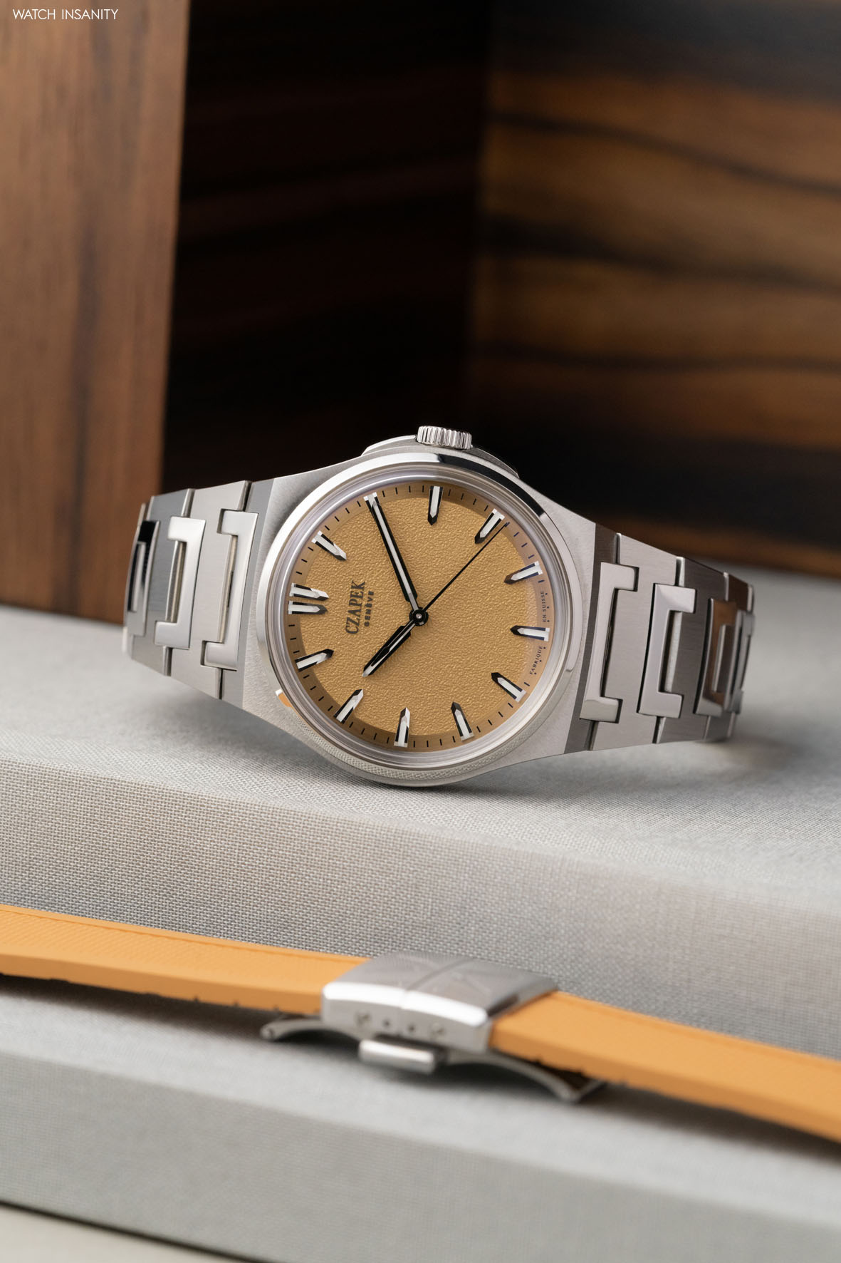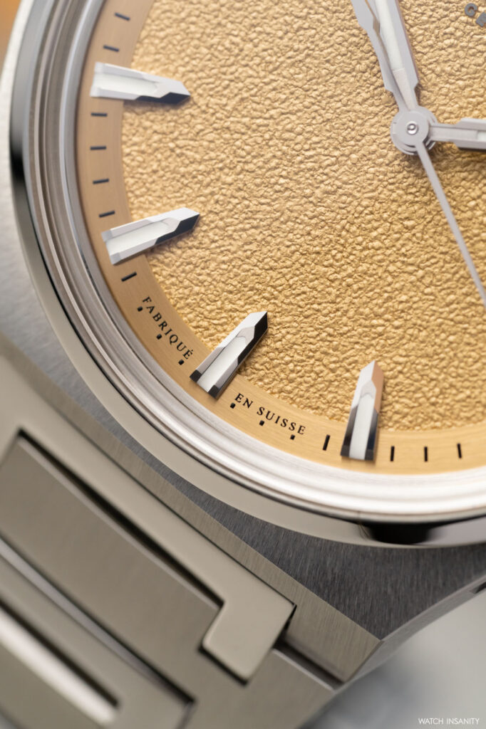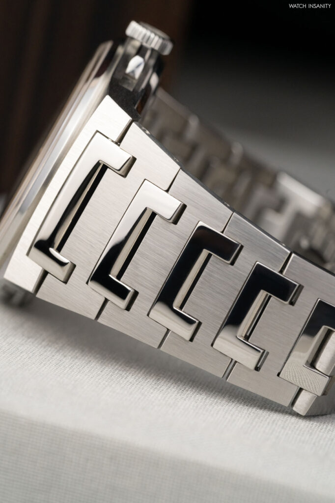 A special mention also goes to the case and bracelet. The former is the classic Antarctique case in steel with a diameter of 40.5 mm. It is distinguished by its workmanship, completely satin-finished soleil, which contrasts with the mirror polish of the bezel. The alternation of satin-finish and polish is echoed on the integrated, tapered bracelet, whose mirror and C-shaped central links are perfectly integrated into the overall architecture, from the lugs to the folding clasp. The watch is also fitted with a beautiful structured salmon-coloured rubber strap matching the dial, which is also closed by a folding clasp.