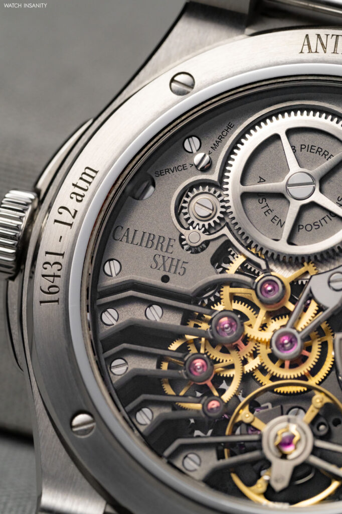 We wrote that the movement is clearly visible from the back: it is the SXH5 automatic calibre, the first to have been designed entirely in-house from a blank page by Czapek. Every part of it was made with great attention to detail, with the help of the best Swiss partners and craftsmen. The micro-rotor, made of fully recycled platinum, is positioned off-centre to allow an in-depth view of the mechanism and its architecture, and winds a single 8.8 Newton/mm barrel. A free-sprung balance with variable inertia and four gold masselotte weights allows for maximum precision adjustment. It is a powerful movement with an optimal balance between inertia and torque to achieve perfect isochronism.