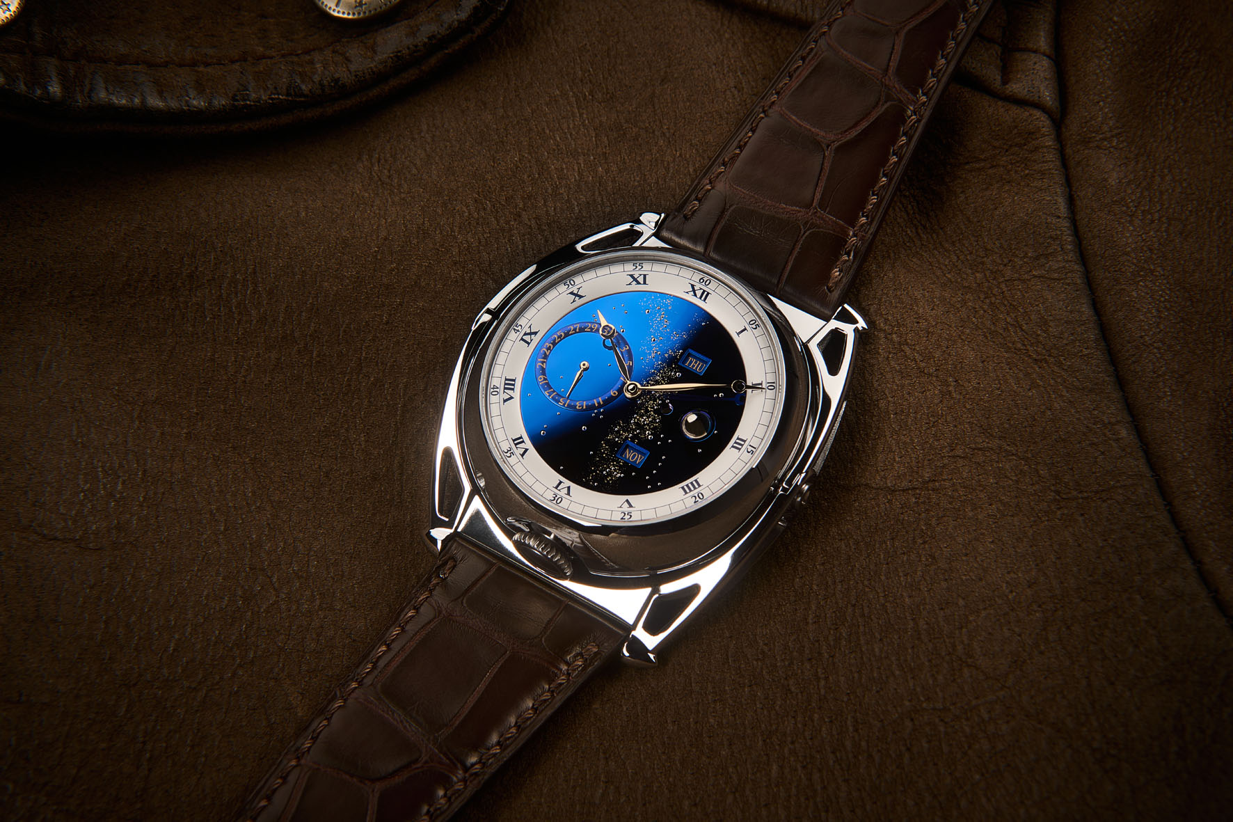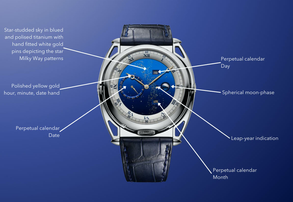 Like the leap-year indicator aligned at 3 o’clock, the subtle play of superimposed blues in the counter rings and apertures, along with the gilded juxtaposition of the day, month and date displays, blend seamlessly into the sky and the Milky Way without ever losing their legibility.