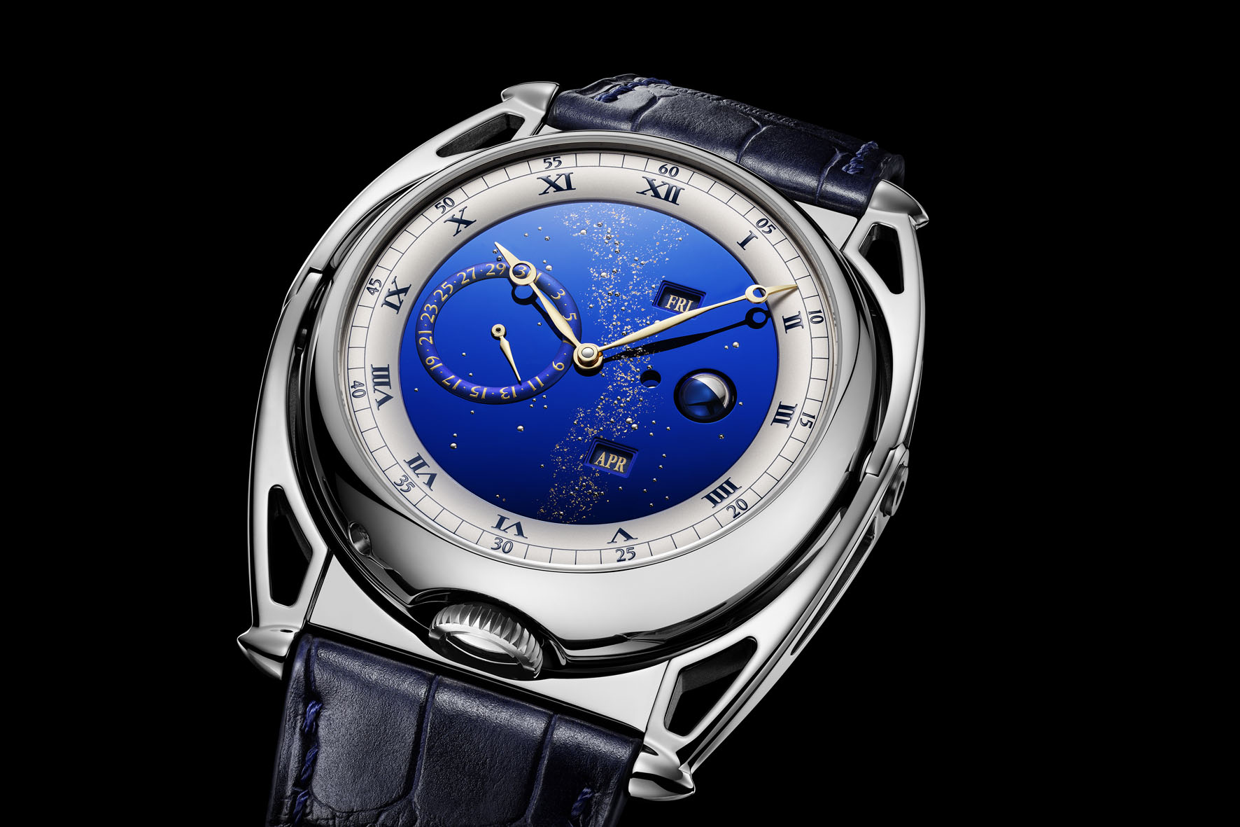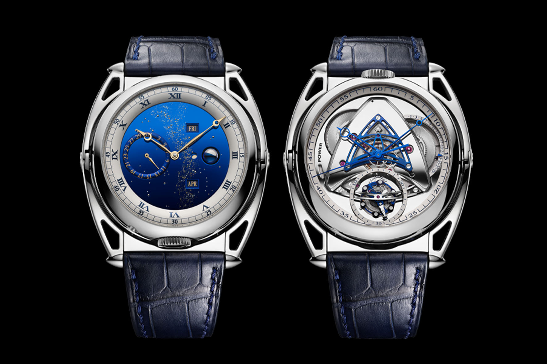 The rounded design of its classically inspired case with its crown at 12 o’clock on the contemporary side (6 o’clock on the traditional side) conceals the technical challenges of a double case complexified by a multiple display of several functions and the combination within a single calibre of eight different horological complications: perpetual calendar, spherical moon-phase indication, retrograde age of the Moon and leap years, ultra-light tourbillon in blued titanium, jumping seconds, power reserve as well as the double display of hours and minutes.