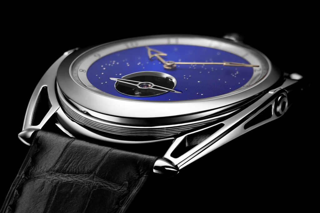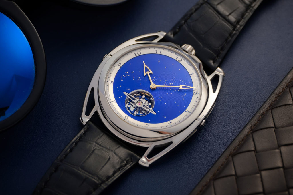 The hour circle is in silver, the minutes in Arabic numerals and the rose gold hands designed specifically for this edition are powered by the DB2115V7 caliber with six days of power reserve, also characterized by the technical innovations of De Bethune on spiral and barrels. Innovations at the service of a fascinating mission: to represent the most beautiful sky, to capture its emotional power, and preserve it accurately so it can be worn on the wrist. (Price CHF 72.000)