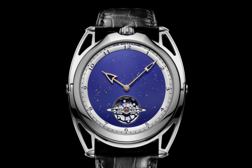 Around the center of gravity of the hands with blued titanium inserts – also a distinctive sign of De Bethune – do not “rotate” indexes but polished spheres like small satellites, while the tone-on-tone motif that surrounds the central part of the elliptical dial it discreetly subtly reveals the movement’s wheels.