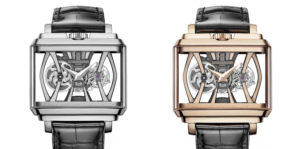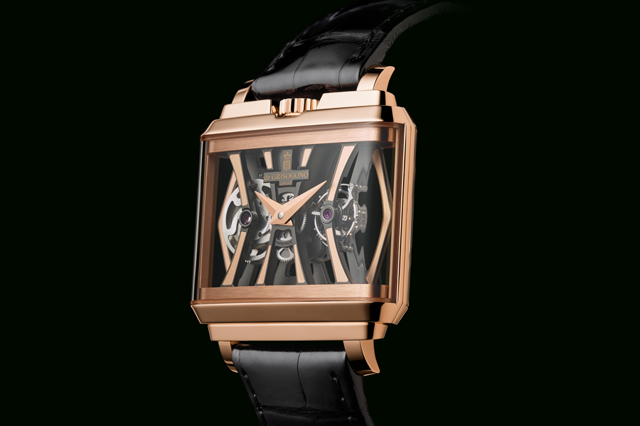 The New Retro Skeleton Tourbillon integrates a legendary complication with a daring style. De Grisogono has developed a movement with an original construction and with an architecture evoking the grilles of vintage cars. As if suspended inside the sapphire case (dimensions: 44 x 51 x 12.3 mm) and held by the bridges, the tourbillon is visible at 3 o’clock.