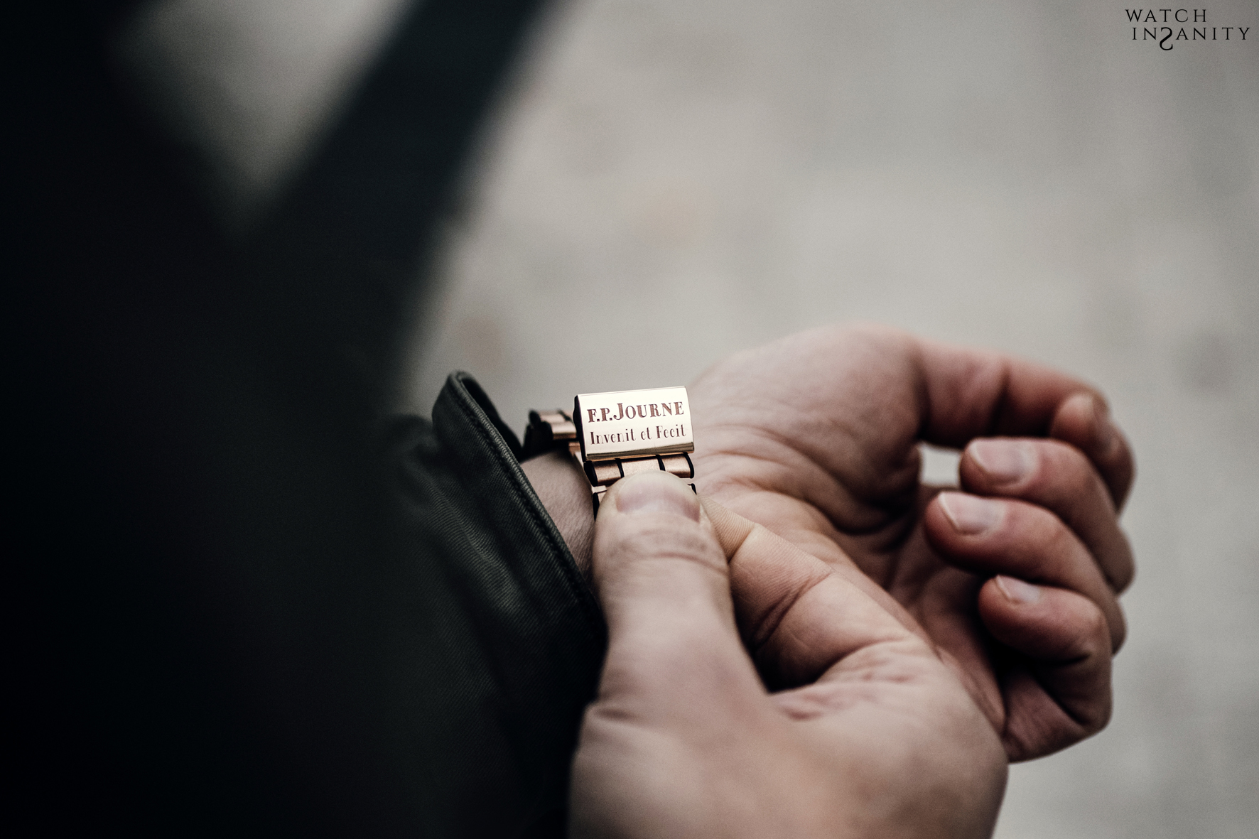 The Chronographe Monopoussoir Rattrapante that we had the chance to try at the F.P. Journe Espace in Milan by GMT Great Masters of Time is in 18 K red gold, but the model is also available in 2 other versions: one in platinum PT 950 and one in titanium grade 5. The case, 44 mm in diameter and 12-mm thick, encloses the new monopoussoir split second chronograph movement with a very large date, made in 18 K rose gold for the platinum and the red gold versions, and in aluminium alloy for the titanium version. This choice confirms Mr Journe’s preference for noble and traditional materials for his movements – the reason being that he wants his timepieces to still be easily reparable 100 years from now, as the old clocks and watches built a century ago are nowadays.