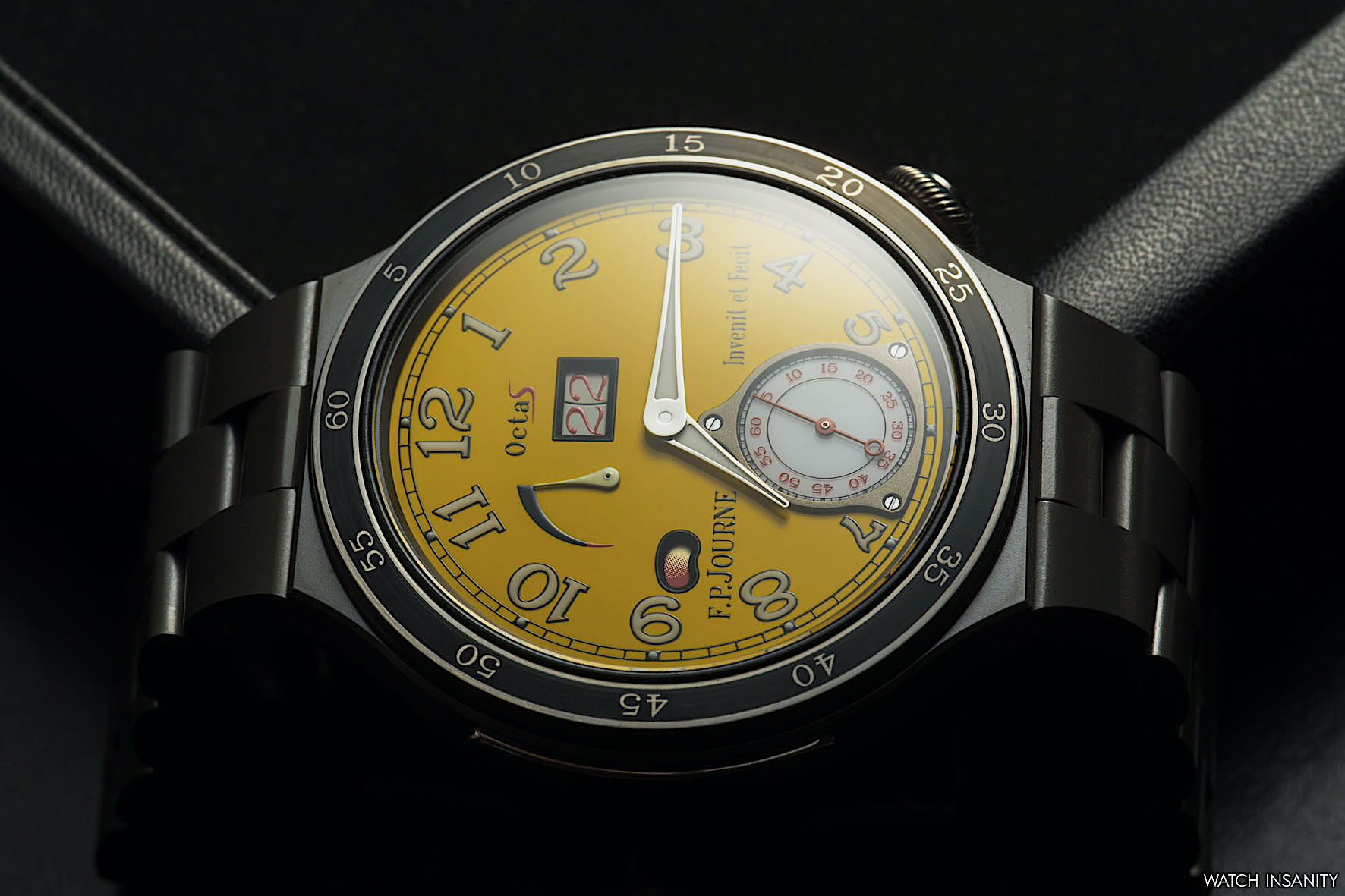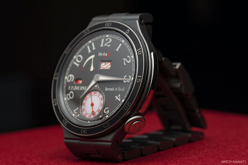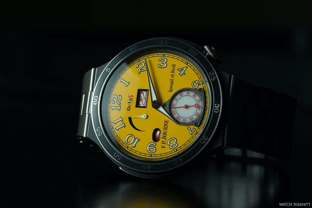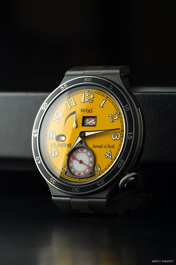 It’s clear from the shots that the Automatique Réserve also embodies one of the typical characteristics of F.P. Journe: the clear and rational readability of the information on the dial, be it yellow or anthracite. Starting from the big date: the size of the window has been increased to 4.7 x 2.6 mm, improving visibility. A big date that, ça va sans dire, jumps instantly.