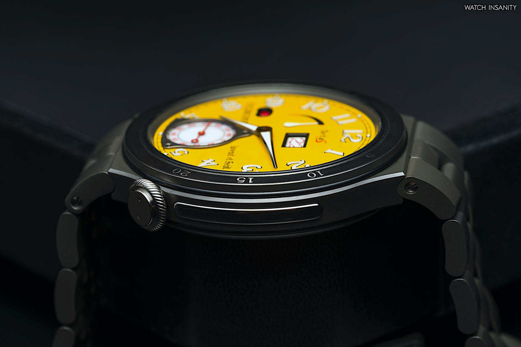 At 6 o’clock, the small seconds counter is a small masterpiece. It’s attached to the dial by three screws and it reminds the speedometer on the dashboard of old racing cars; it is made of white sapphire, with the hand and numerals in red and the chemin de fer motif in black. Together with the large date, it is the strongest element of this watch, with a though presence that not even the yellow of the dial can diminish.