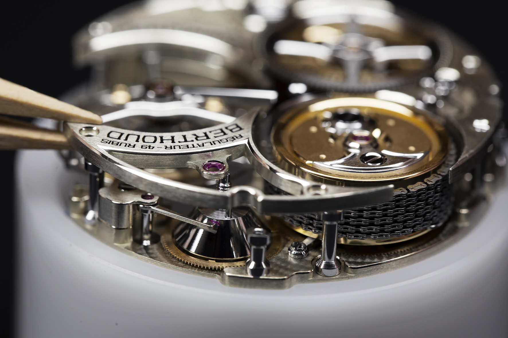 The distinctive nature of the FB-T.FC.R calibre lies in its inverted upside-down barrel and fusee, and particularly in the fact that both elements are suspended, meaning held on only one side. A patent has been filed for this construction which saves precious millimetres. At 9.89 mm thick, the movement of the Chronomètre Ferdinand Berthoud FB 1R.6-1 thus remains extremely thin for its category despite the regulator-type display and the new power-reserve indication.