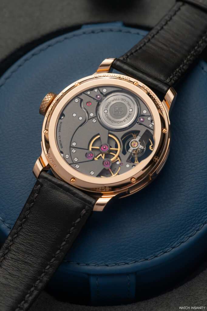 This porthole brings us to the aesthetics of the Chronomètre FB 3SPC. The 42.3 mm by 9.43 mm case is made of white gold or pink gold. Ethical gold in both cases, that is, gold extracted from mines using sustainable processes and respecting the miners’ living and working conditions. Its round shape is reminiscent of the silhouette of early 19th century pocket watches, such as the No. 26 decimal watch made in 1793 by Louis Berthoud (the same as the cylindrical spiral), now on display in the heritage collection of Chronométrie Ferdinand Berthoud in Fleurier, Switzerland.
