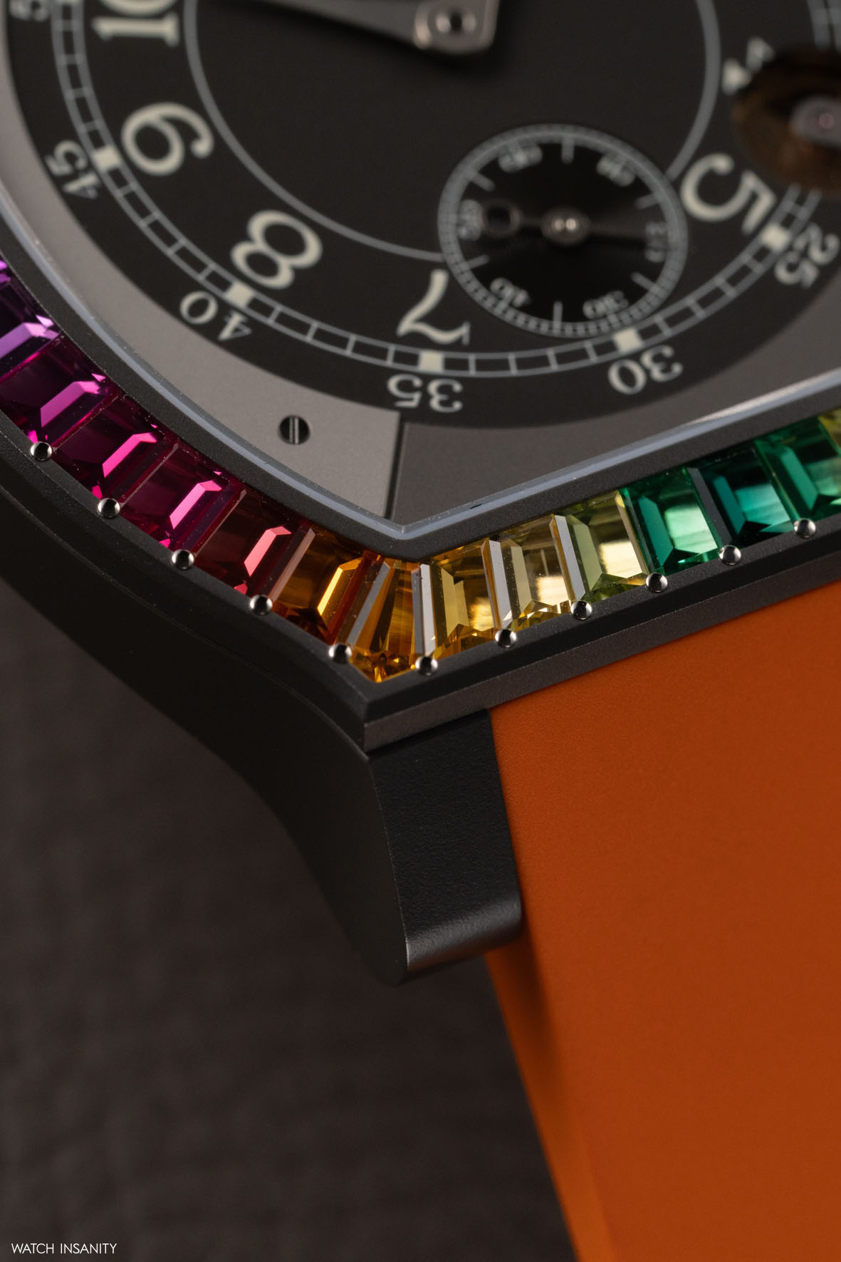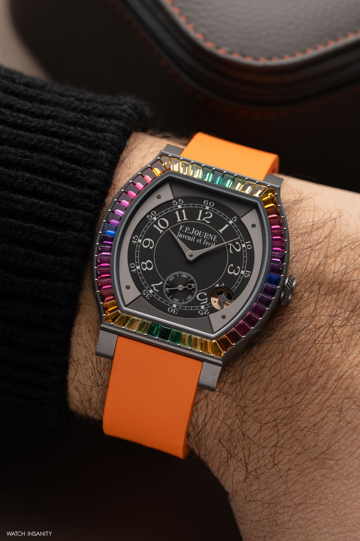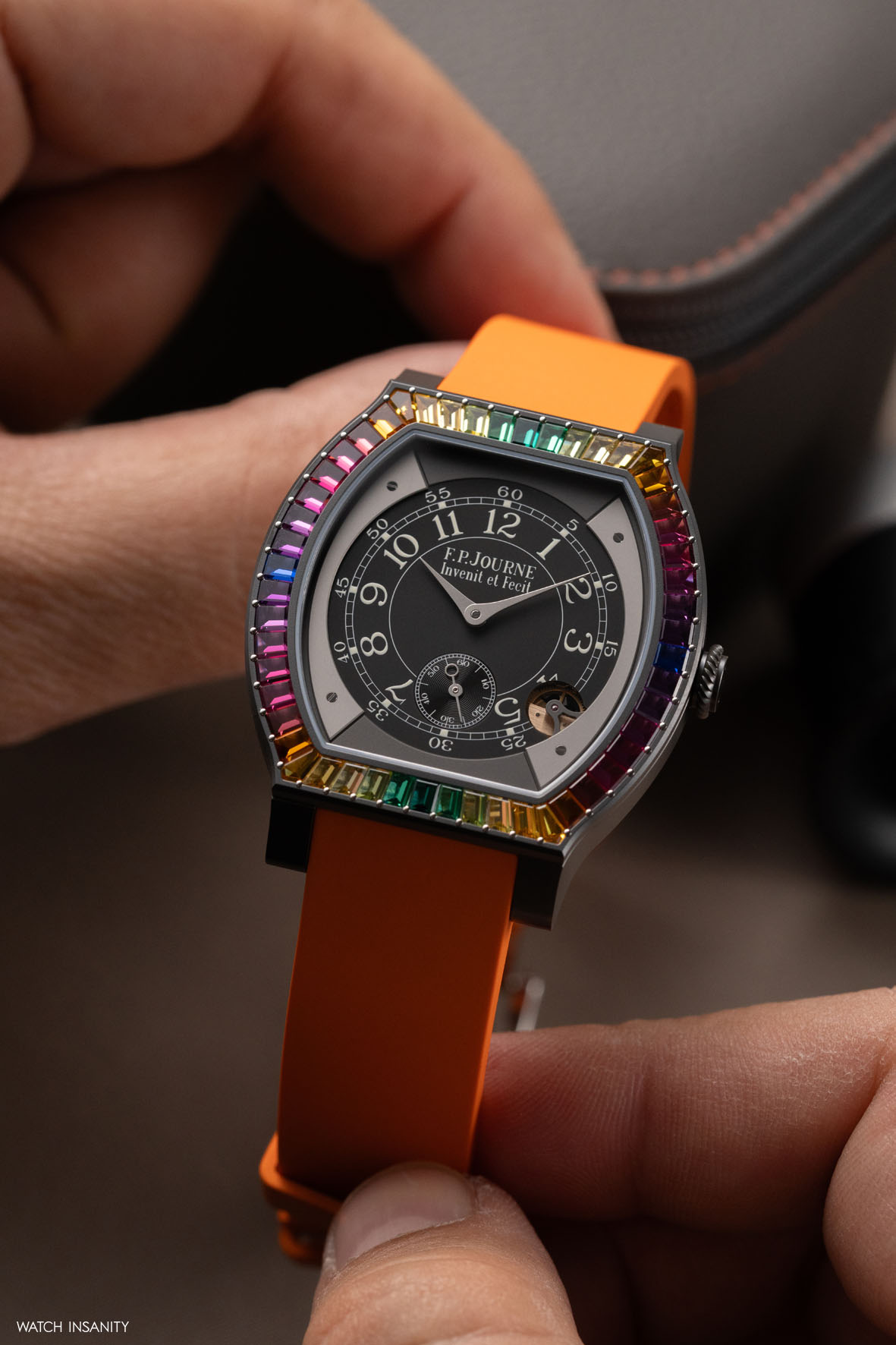 The timepiece is a tribute to the man rather than the partner, mainly in terms of its aesthetics. Gino stood out for his flamboyant, brightly coloured clothes. He always wore an élégante with a yellow strap along with various accessories, including diamond earrings. These aesthetic choices reflected his approach to life, which was colourful, lively and full of passion, and which François-Paul Journe has brought to the bezel of the élégante Gino’s Dream. It is adorned with 52 glass-ceramic baguette-cut stones in shades of the rainbow. What other brands conceive as a “Rainbow” bezel has a different, deeper meaning here, evoking the bond between the Master and his close friend.