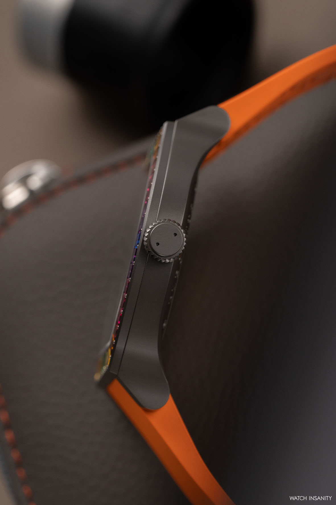 The Boîtiers de Genève is also responsible for creating the case of the élégante Gino’s Dream, available in two versions. Both measure 48 x 40 mm and are 7.95 mm thick; both are made of grade 5 titanium, one of which is the Titalyt version. This exclusive process subjects the metal to an electro-plasma oxidation treatment, which improves its resistance to wear and corrosion and increases its hardness, also giving it a distinctive anthracite colour. The rubber strap is available in 13 colours, but yellow is perhaps the most fitting, a further tribute to Gino’s friendship. The fully luminescent dial, originally developed in white and later in black by The Cadraniers de Genève, ensures excellent readability in the dark.