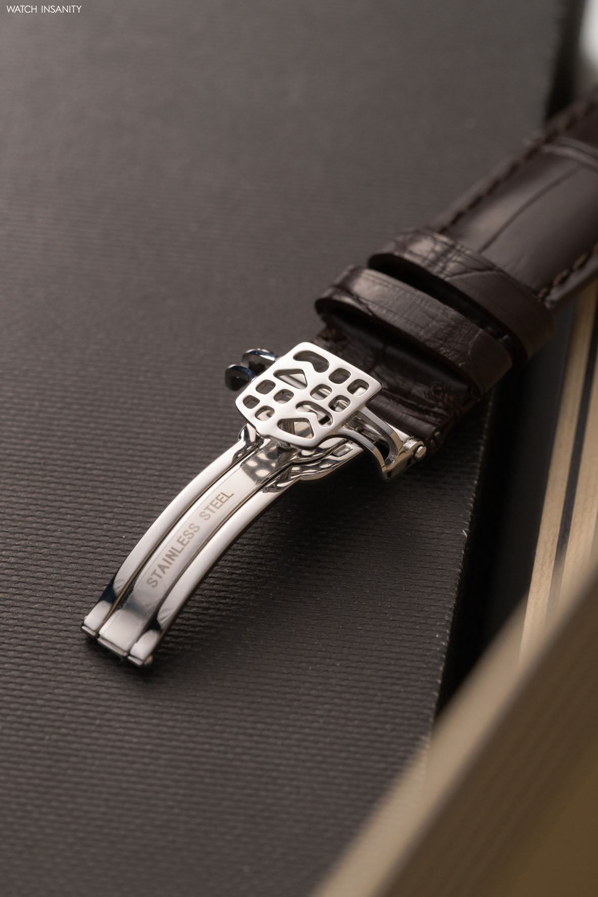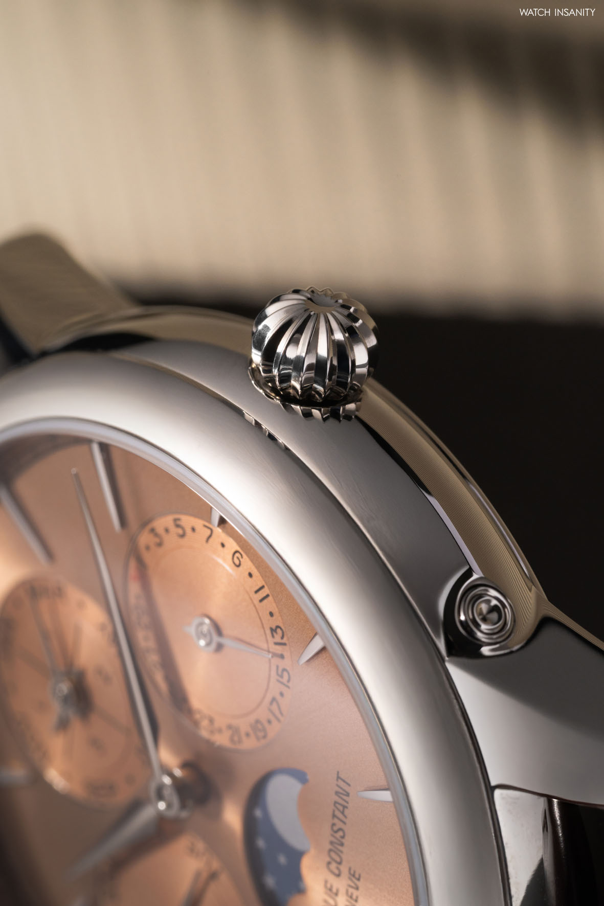 As already mentioned, the three-part steel case of the Frederique Constant Classic Perpetual Calendar Manufacture is now 40 mm wide, with a very slim profile for a perpetual calendar: 12.1 mm, the same as its predecessor, the 42 mm Slimline Perpetual Calendar Manufacture. The polished finish, slim bezel and rounded shapes make it elegant and perfectly matching with the onion-shaped crown and its pronounced knurling.