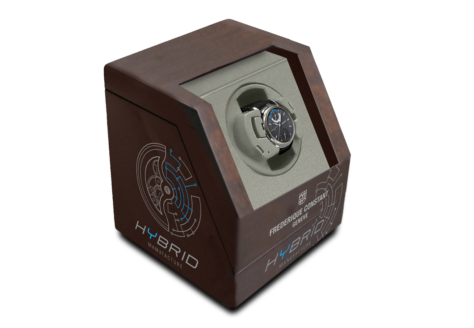 The Hybrid Manufacture is delivered into a luxurious wooden winder box offering: 1) a removable charger for the electronical Smartwatch functionality and 2) a winder rotating box that charges the barrel in the mechanical caliber.