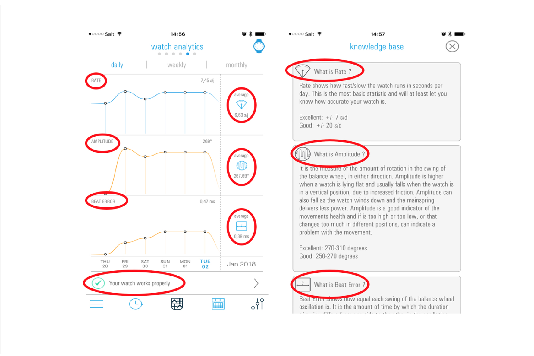 Once per day at 4.00am, the watch analyzes automatically (no requested action from the user) the health of the mechanical movement. Inside the caliber we analyze the oscillations of the movement with a sophisticated Algorithm. 3 measures are taken and reported: Rate, Amplitude and Beat error.