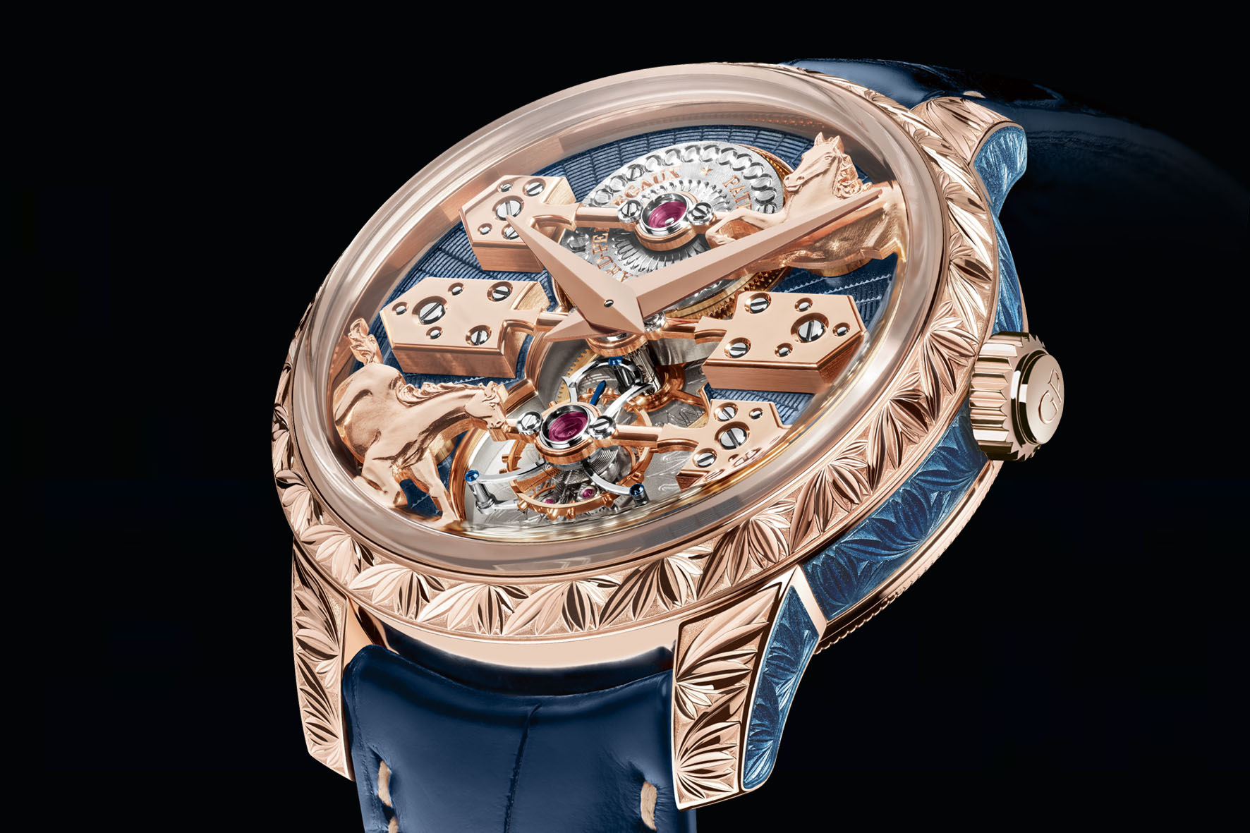 To the rear of the watch, the back of the blue enamelled secret cover features three horses, again inspired by the original La Esmeralda and adorned with a sunray guilloché decoration and blue grand feu enamel. The horses return, but their origin remains an enigma or, as they say at the Manufacture, ‘an equine mystery’.