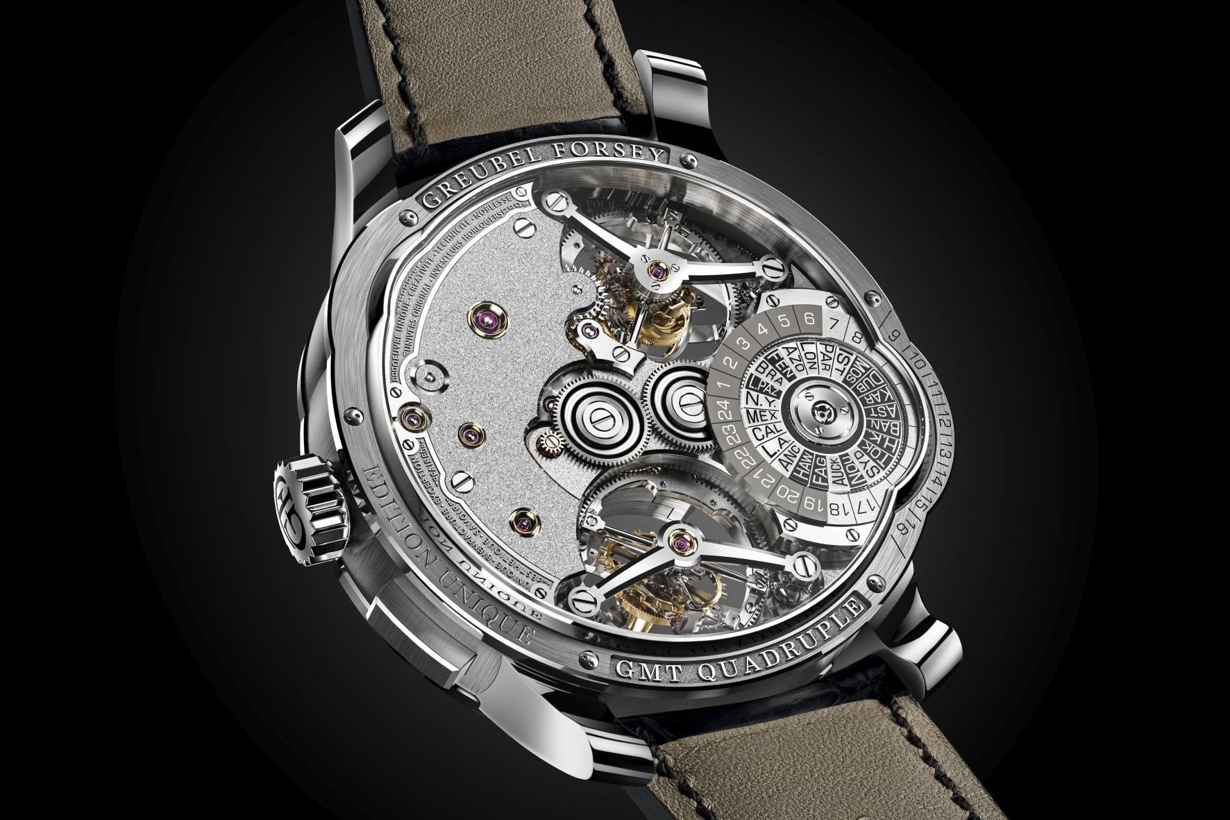 20 March 2019Robert Greubel and Stephen Forsey have shown creative daring and boldness in uniting their second Fundamental Invention, the Quadruple Tourbillon, with their ground breaking interpretation of the GMT with its outsized rotating globe. Displaying three time zones along with a universal time function, this exceptional timepiece is distinguished by its three-dimensional architecture created with extreme attention to fine craftsmanship.