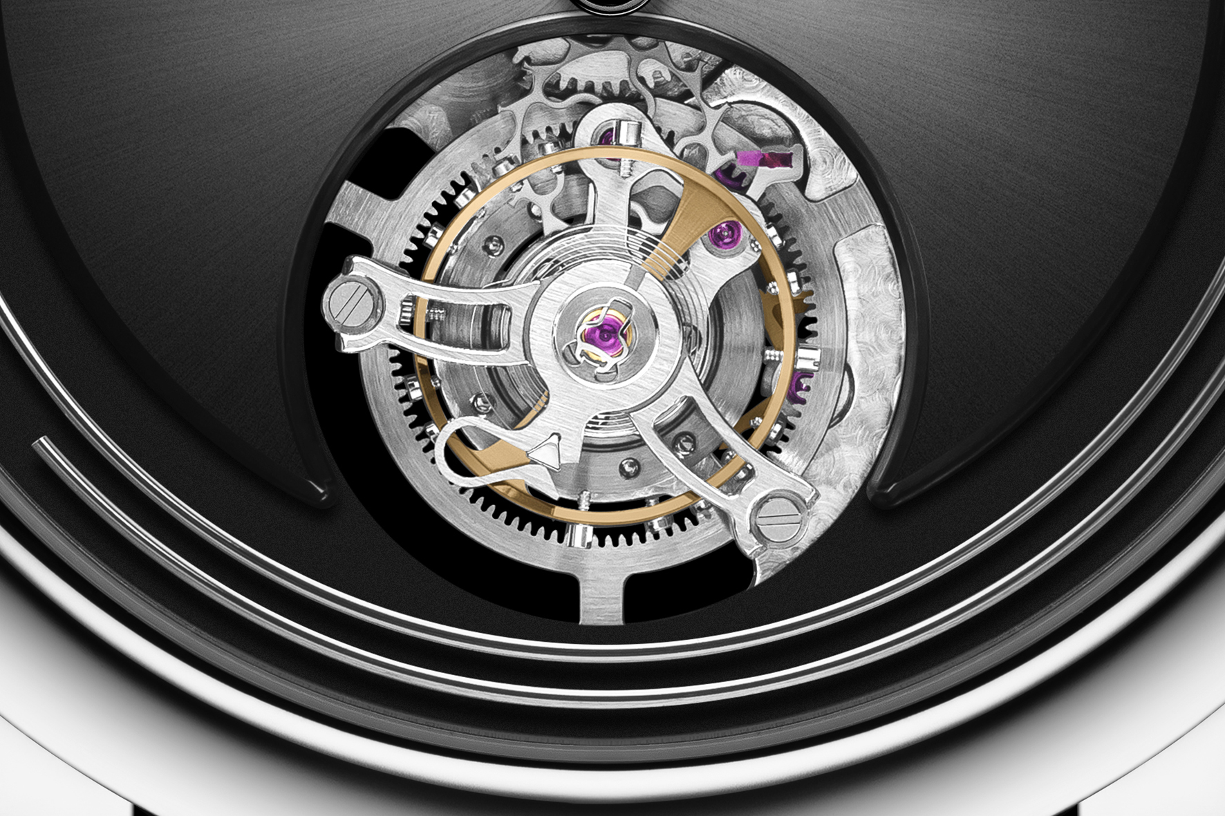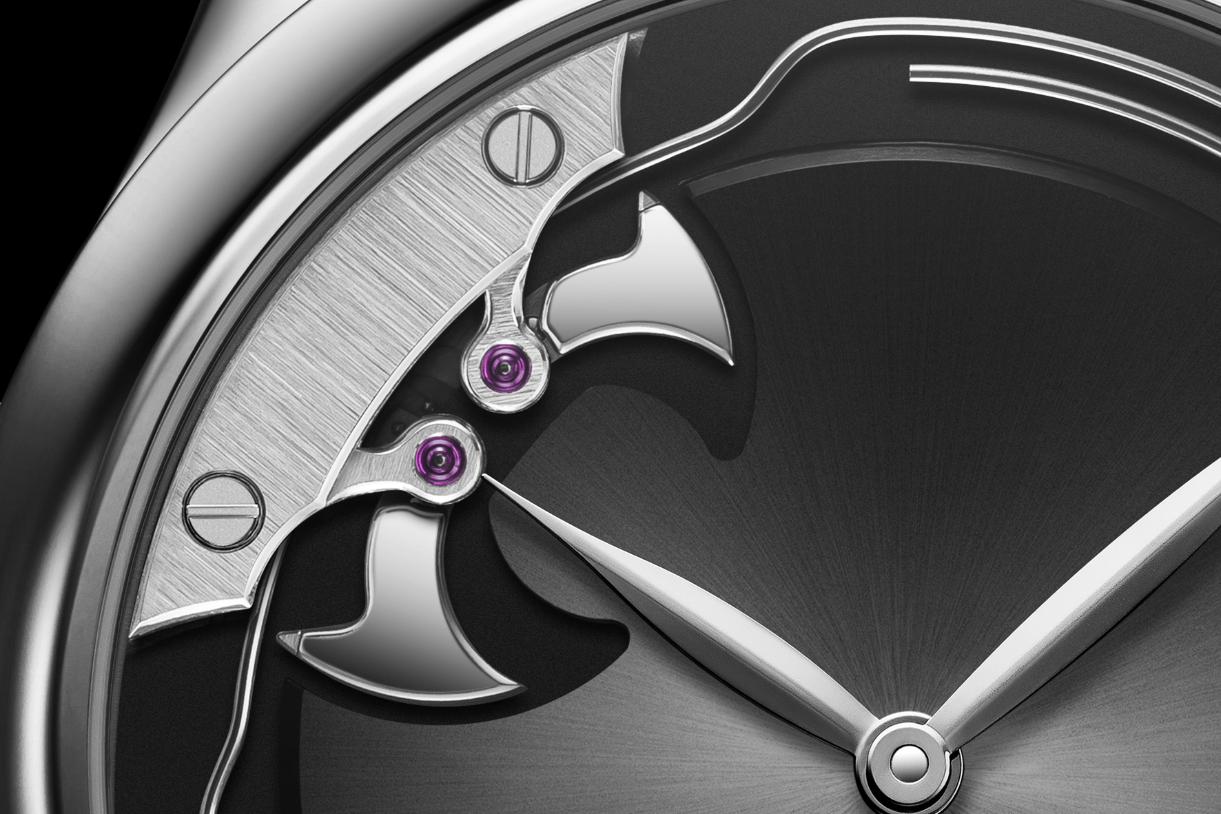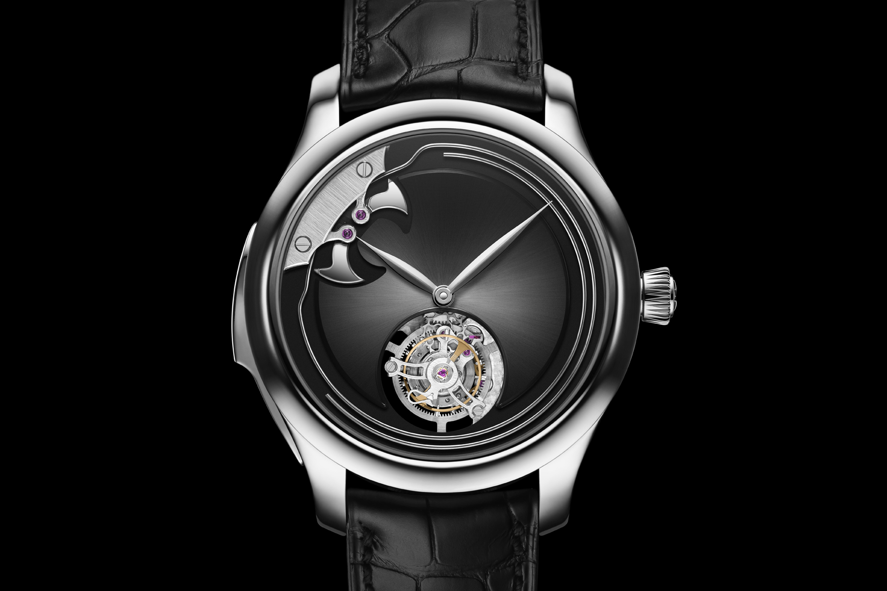 26 March 2019For the new Endeavour Concept Minute Repeater Tourbillon, H. Moser & Cie. highlights one of the most traditional watch complications and combines it with a magnificent flying tourbillon in a twirling waltz. The two shaped chimes and the minute repeater hammers shine through against the lacquered black dial, intertwining the one-minute flying tourbillon at 6 o’clock. To develop this marvel of ingenuity, H. Moser & Cie. drew on the expertise of MHC Manufactures Hautes Complications SA, a specialist in minute repeaters. Together, the two manufactures created a brand-new design, showcasing the beauty of the complication by positioning the chimes and the hammers on the dial side.