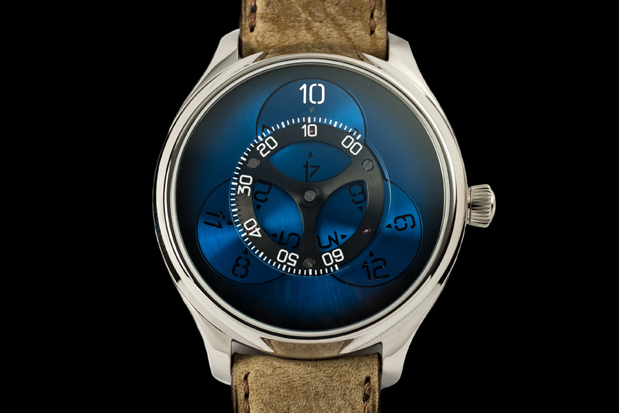 The Funky Blue dial features several planetary gears mounted on star wheels: in the centre, the main disc in sapphire displays the minutes on a 240° sector; three smaller discs bearing the hour numerals are arranged around it. Each planetary gear rotates on its own axis, revealing the hour in a display inspired by the original planetary systems. The wide display angle of 240° gives the Endeavour Flying Hours highly accurate legibility. To enhance the mechanism’s legibility, the current hour numeral appears in white, following the minute disc as it completes a revolution before disappearing to be replaced by the next hour. A hypnotic ballet that captivates the eye.