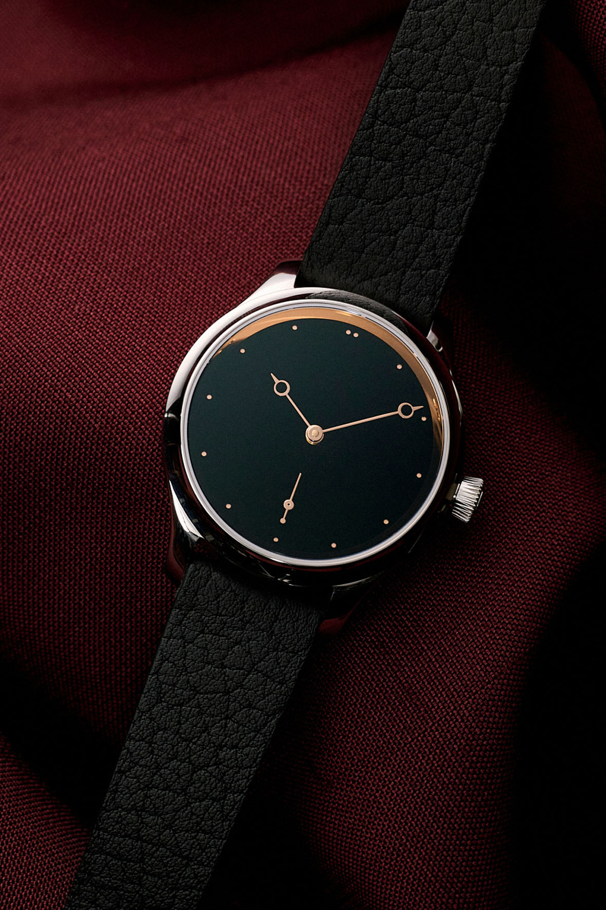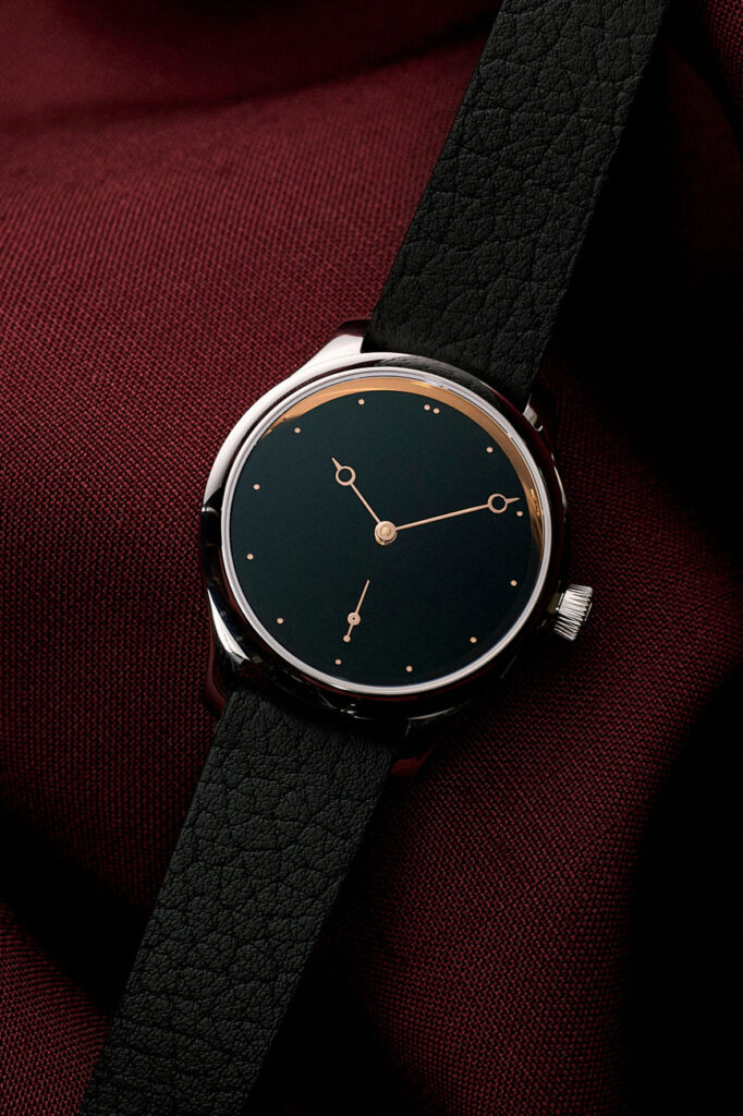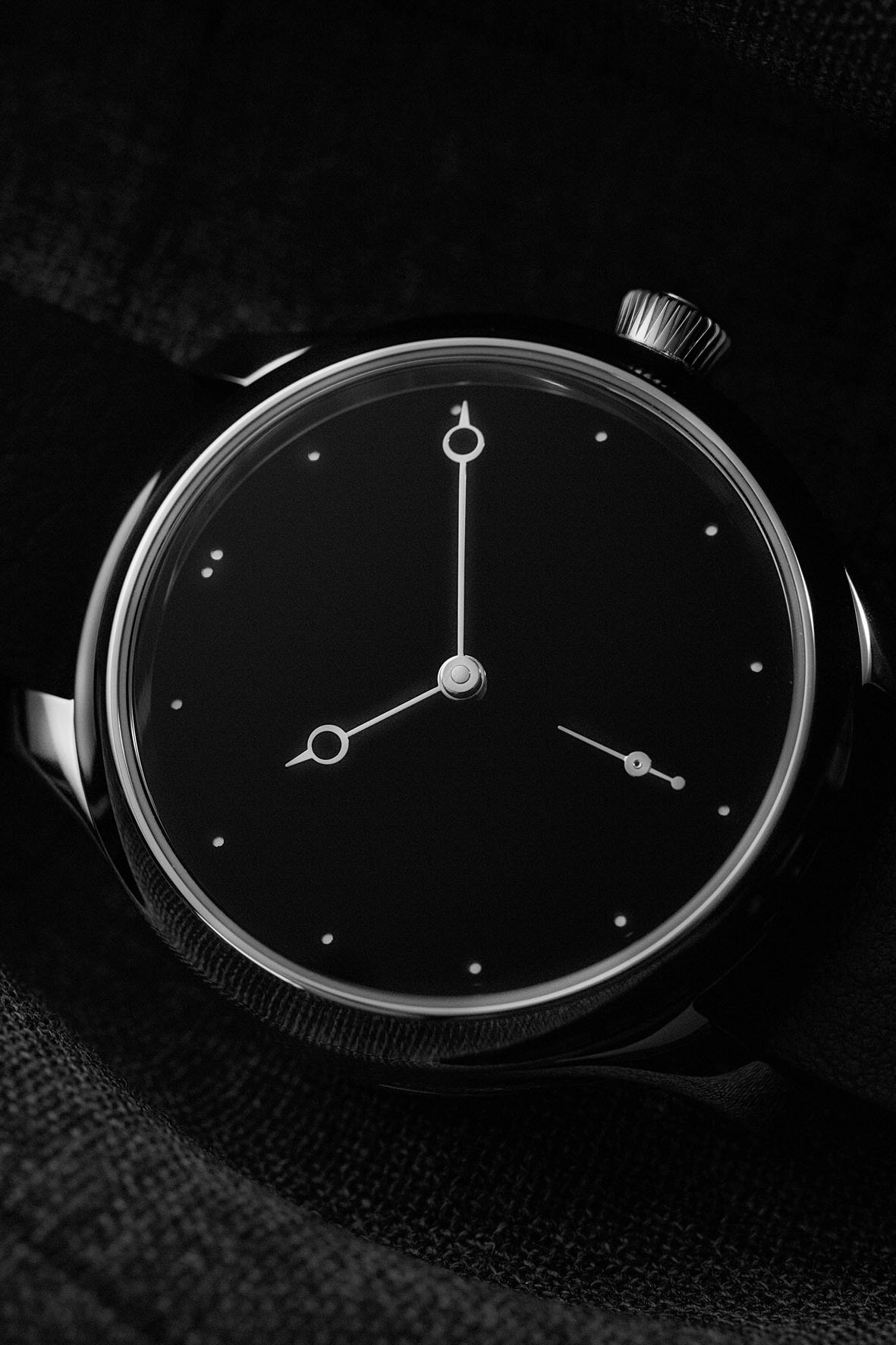 The Endeavour Small Seconds Total Eclipse has a classic feel, which extends all the way to the hands, a stunning complement to the indices. The hour and minute hands, finished with a circle at the tip, reflect the Breguet style especially prized by Mark, while the small second hand is adorned with a dot-style marker, echoing the indices. “Absolutely everything in this model links back to this quest for ultimate elegance, combining classicism with a contemporary feel,” explains Edouard Meylan, CEO of H. Moser & Cie. “It’s 38- mm diameter is perfectly balanced. We opted for the smallest and finest of our movements, the hand-wound HMC 327 calibre, with an offset small second at 6 o’clock, reminiscent of the pocket-watch style.“