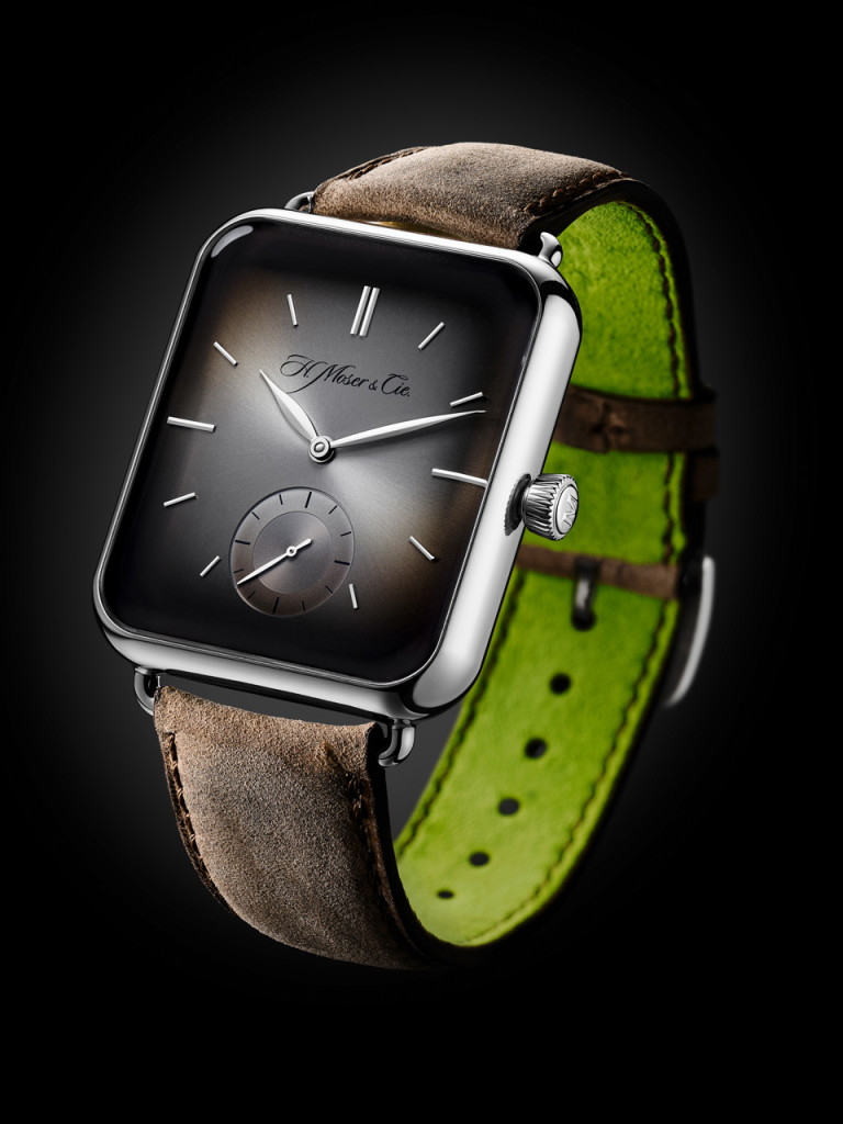 H. Moser & Cie. has chosen to do the opposite: the Swiss Alp Watch is inspired by the modern design of smartwatches, but is entirely mechanical. With its 100% Swiss Made manufacture movement and a minimum power reserve of 100 hours, the Swiss Alp Watch is designed to last and is well equipped for the next generation. With its iconic fumé dial, a classic signature dial for H. Moser & Cie., it is timeless. Its tapered lugs give it a vintage look, and the kudu leather strap with a leather lining in Moser green, lend the watch a modern edge that also stands testament to the company’s attention to detail.