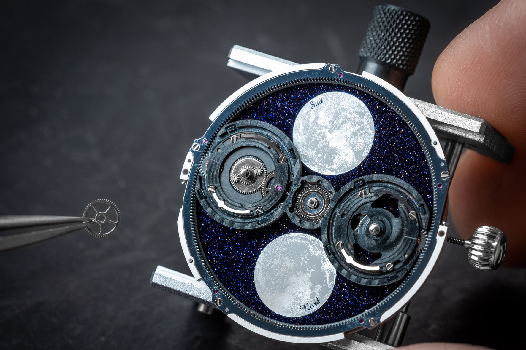 Inside the 43 mm white gold case with asymmetrical lugs, the meteorite or aventurine inlaid with mother-of-pearl form a cosmos in which the white or black lacquered mobile counters with Arabic numerals float above the hemispherical moons.These mischievous displays have swapped cardinal points, with the south above and the north below.