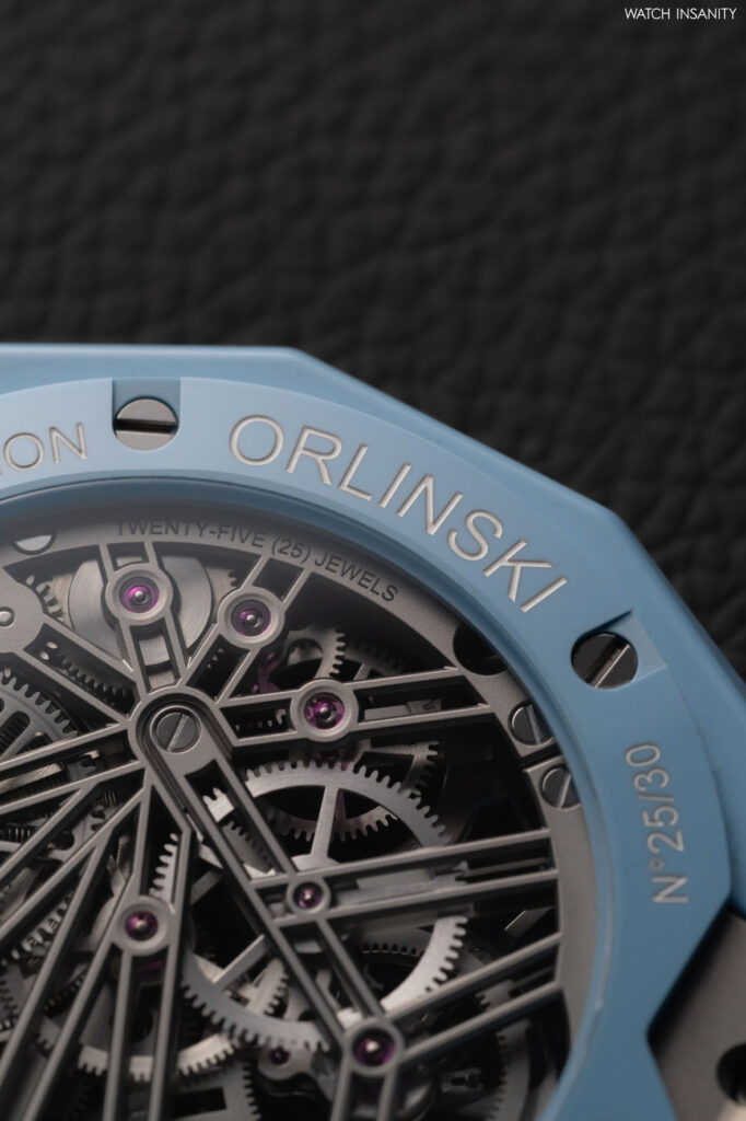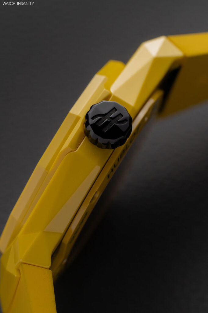 Speaking of details: on the yellow version of the Classic Fusion Tourbillon Orlinski, theblack bridges match the titanium screws on the bezel coated in the same colour. On the blue one, the screws and bridges are matching titanium, uncoated. Black returns on the ceramic buckle of the yellow reference, titanium on the buckle of the blue reference.