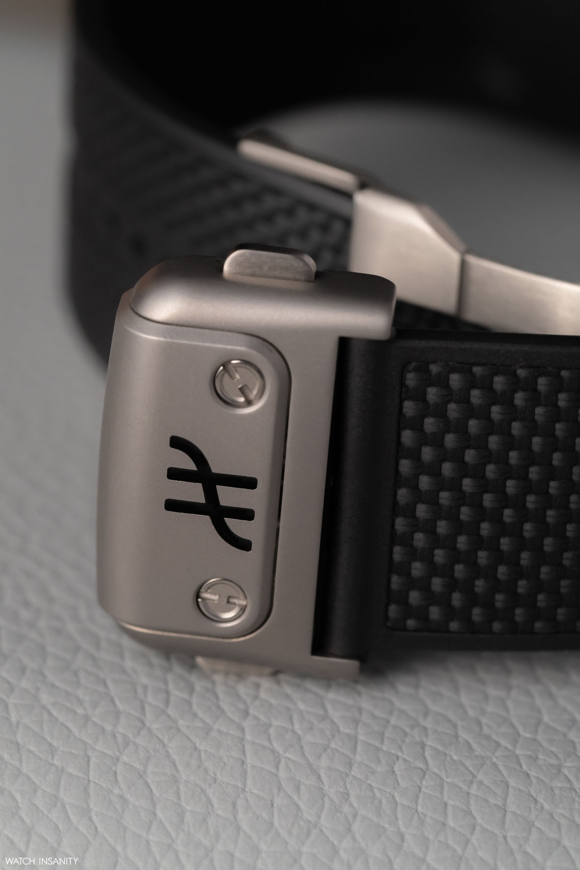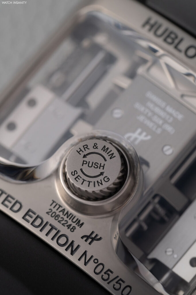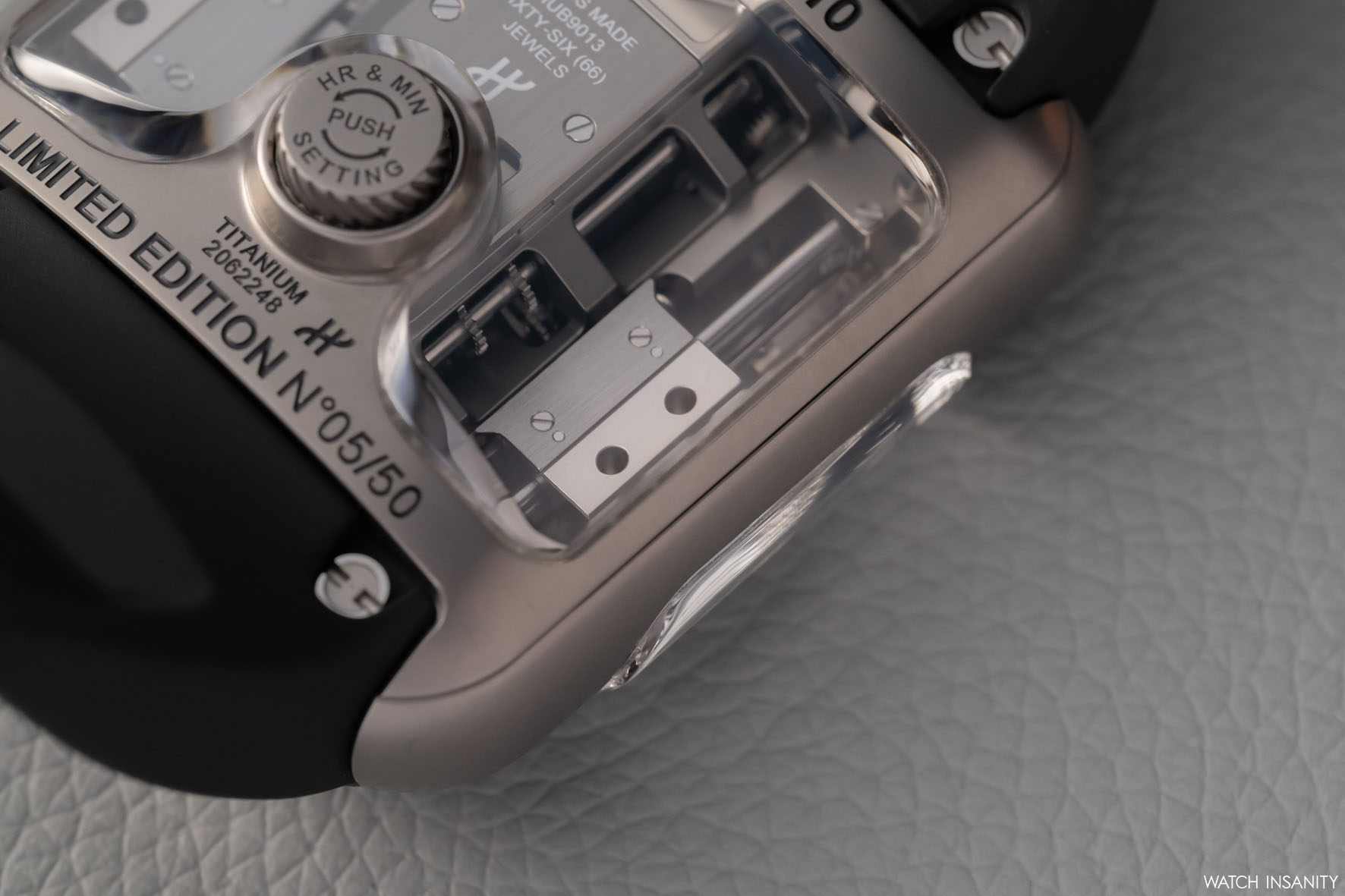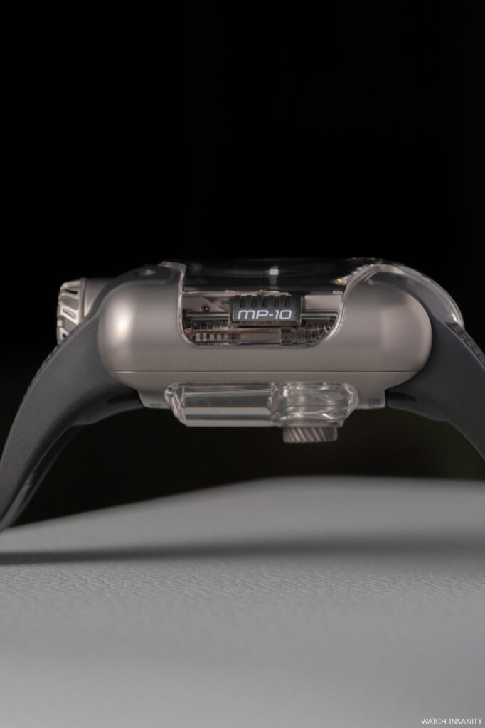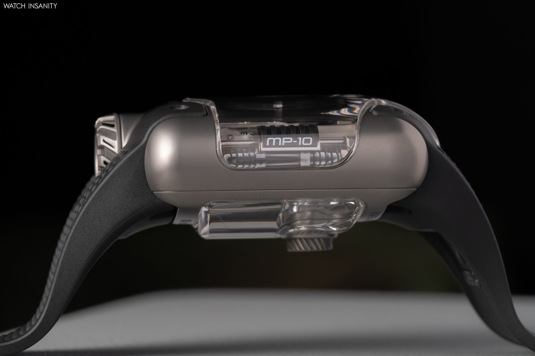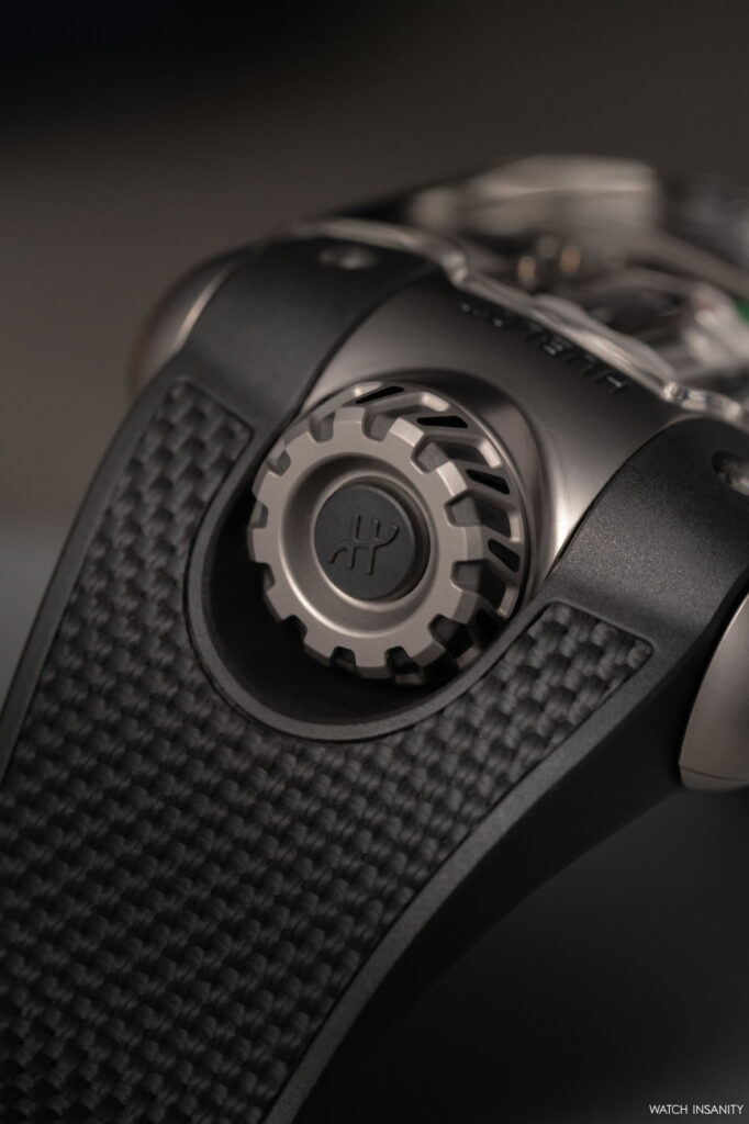 In this complex, sci-fi architecture it was difficult to find a conventional location for one crown, let alone two. And, indeed, they are placed in an unusual way. The first, the largest, is on the top of the timepiece and is used exclusively for manual winding. The second is a removable crown on the back of the watch, used to set the time. The case back is made of microblasted titanium and, together with the sapphire cover, forms a whole (hard to speak of a classic case, in this case) that is water-resistant to 3 atmospheres, while its dimensions are considerable: 54.1 x 41.5 mm, for a thickness of 22.4 mm.