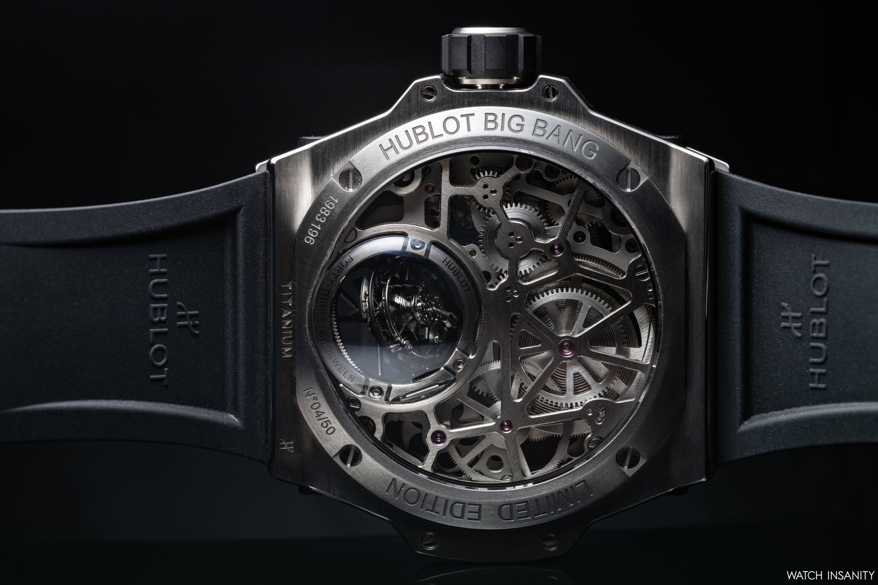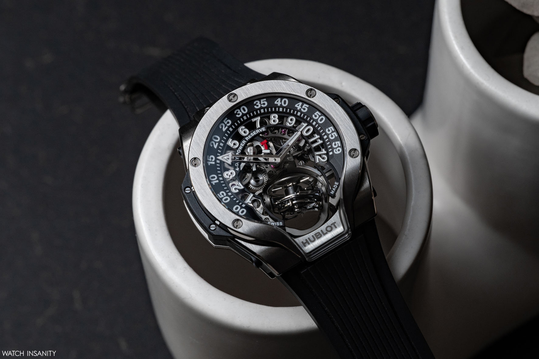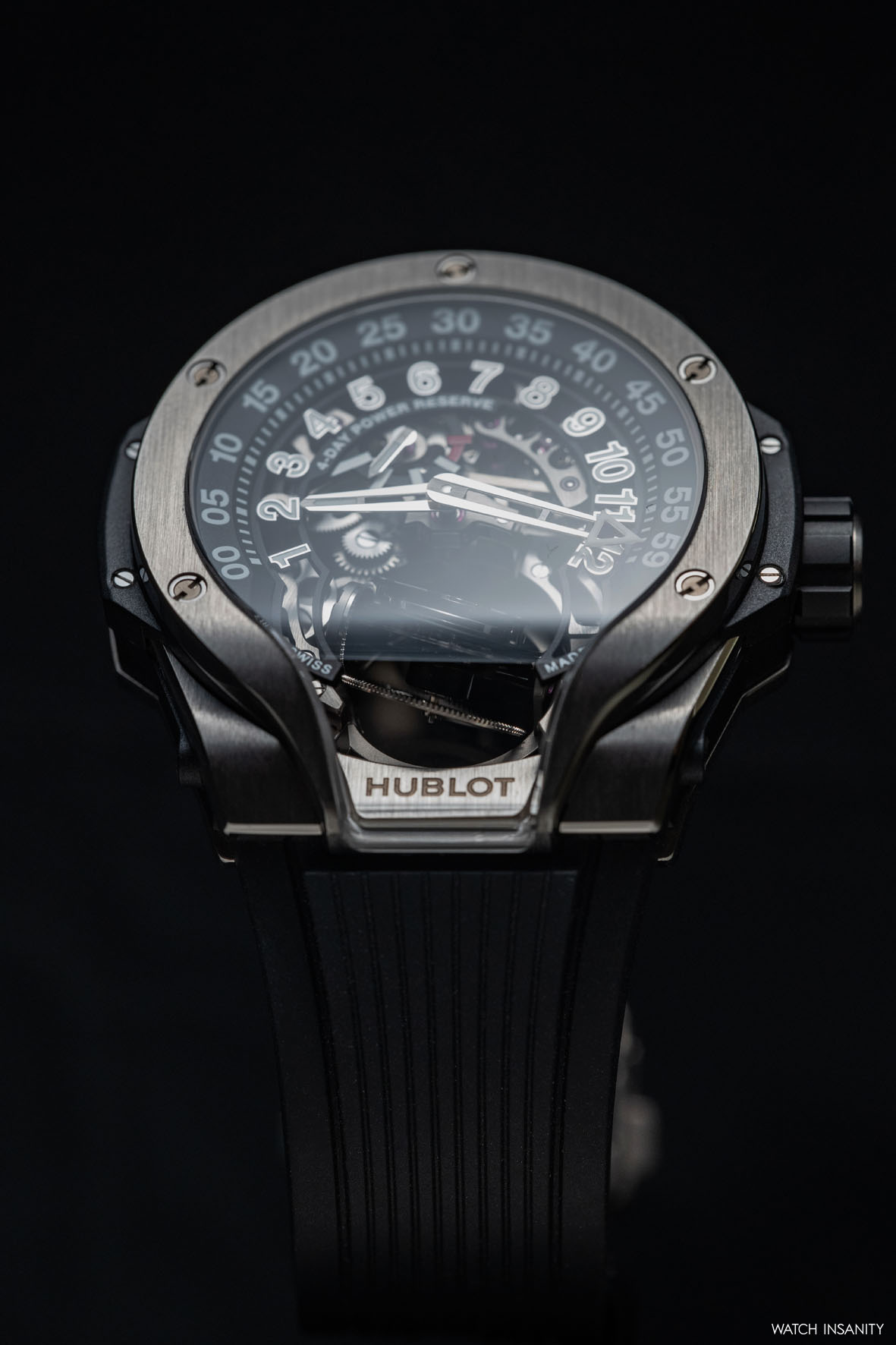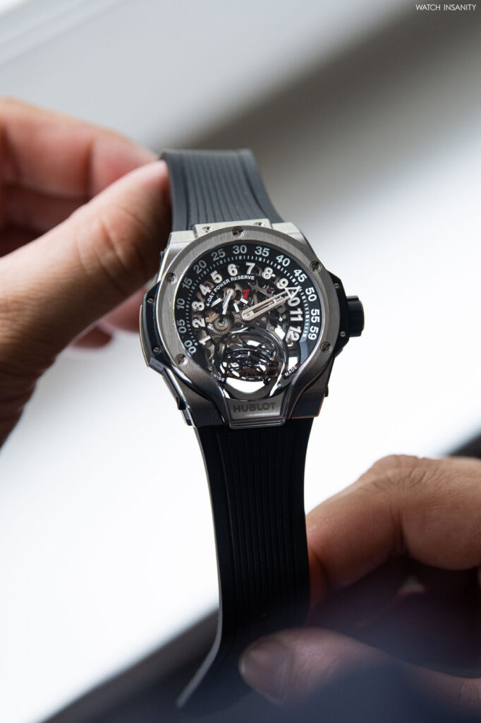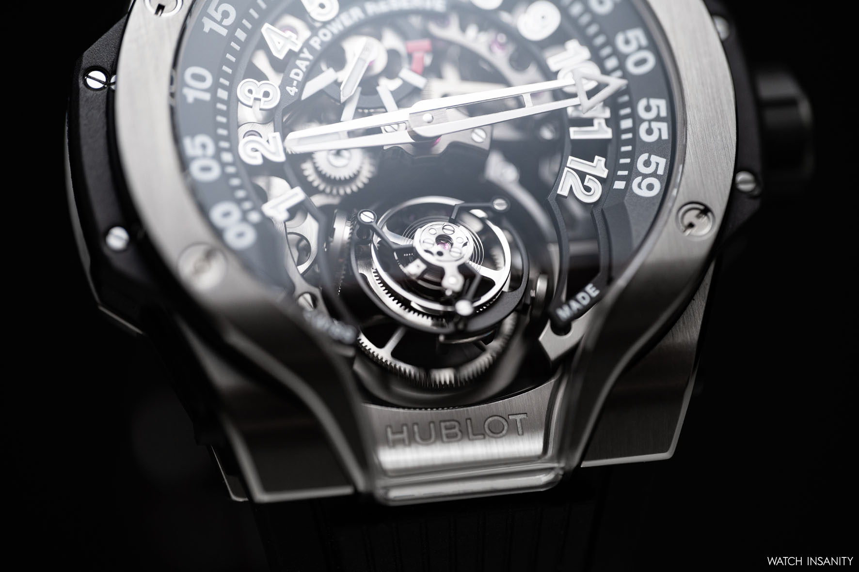 The case is of generous dimensions, as expected from Hublot and, specifically, from a watch like this: 44 mm in diameter and 16.7 mm thick. It is entirely made of satin-finished titanium, so are the case back and bezel, and is waterproof up to 3 bars. It is open at 6 o’clock, where the bezel gives way to the extension of the anti-reflective sapphire crystal, in order to fully highlight the tourbillon at work. The watch is completed by the classic black lined rubber strap (Hublot’s aesthetic signature) with a folding clasp also in titanium, like the case.