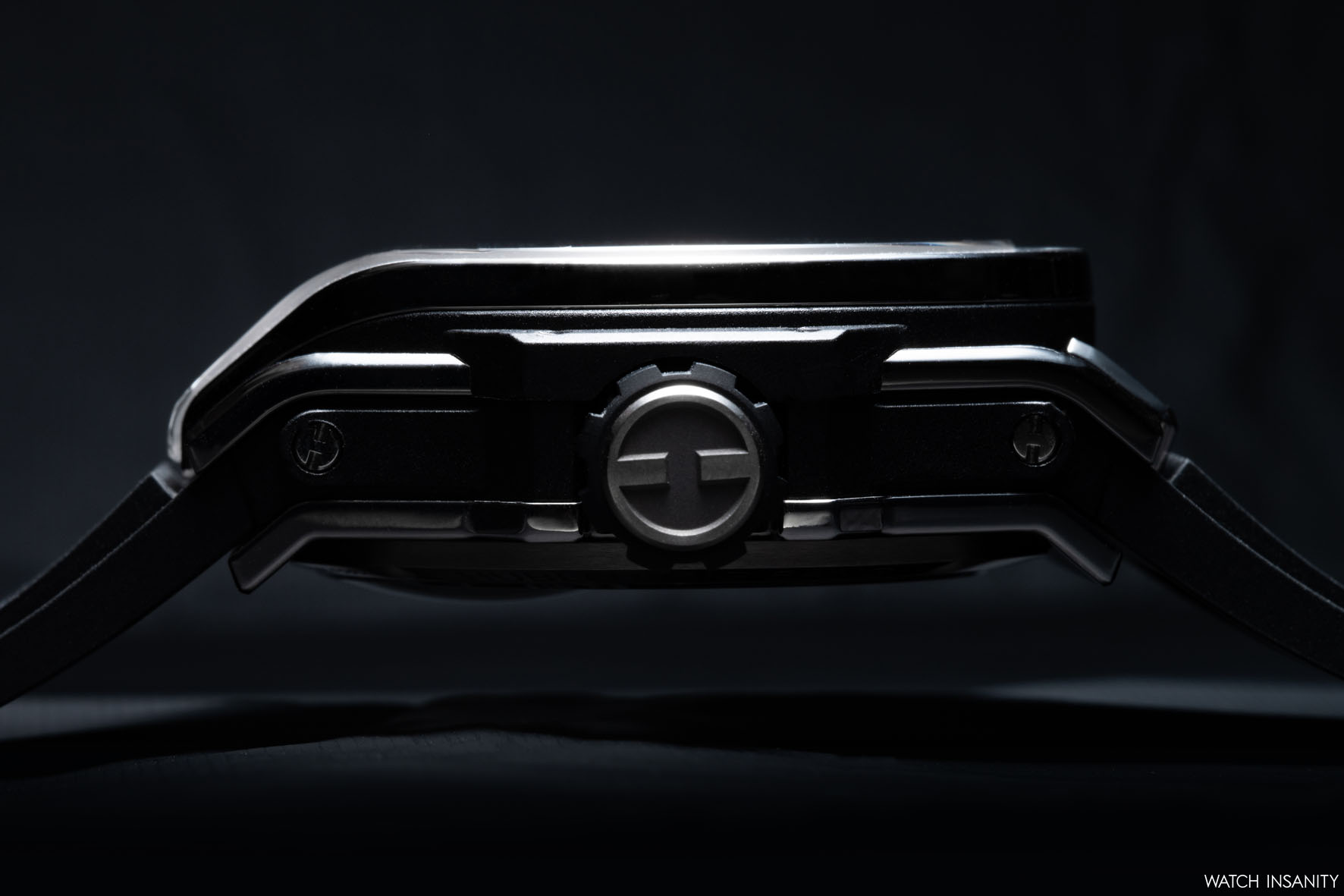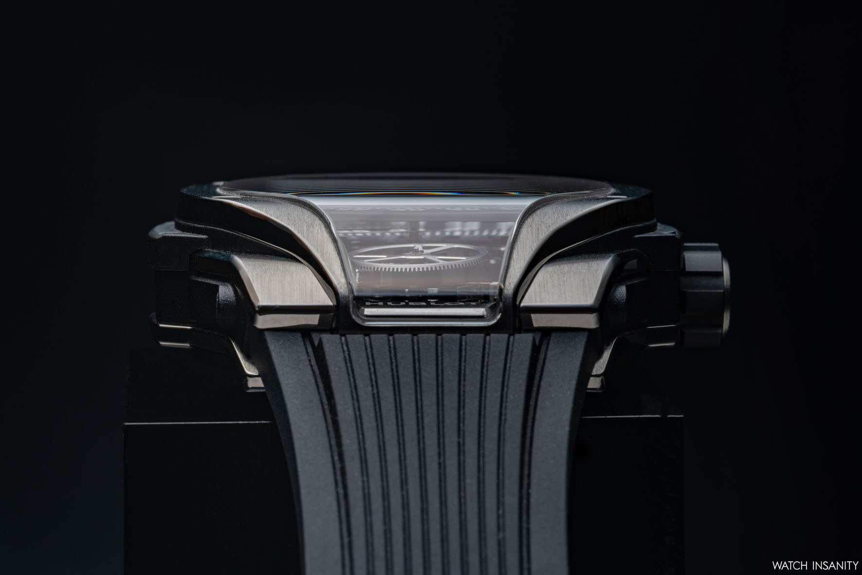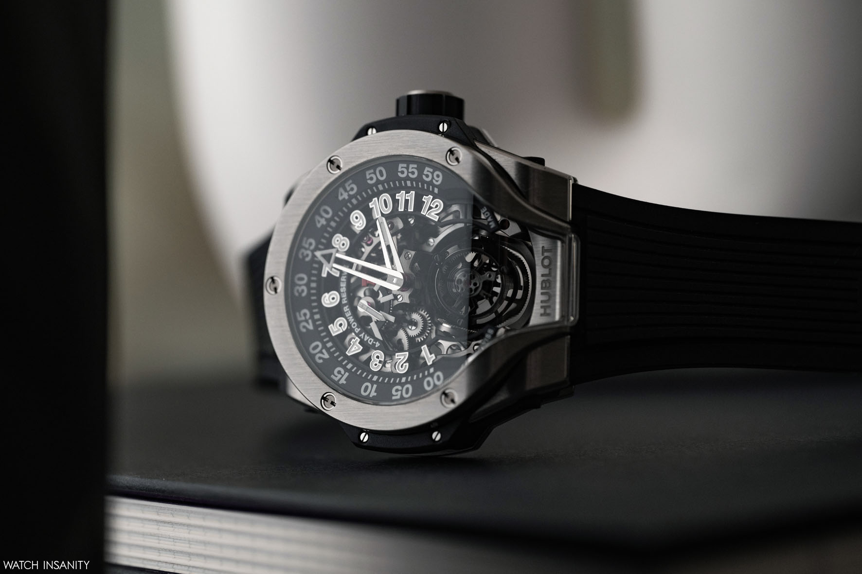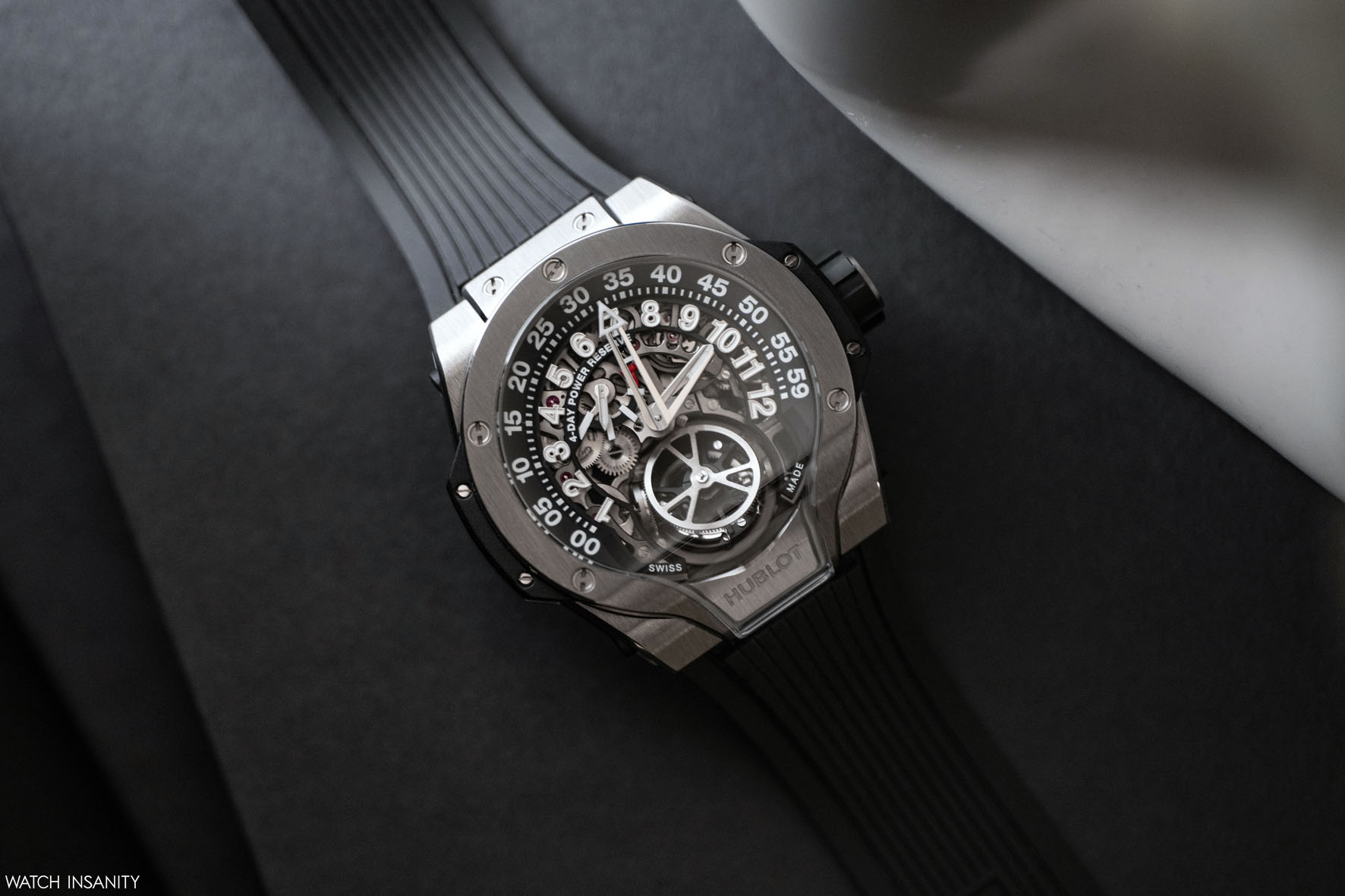The case is of generous dimensions, as expected from Hublot and, specifically, from a watch like this: 44 mm in diameter and 16.7 mm thick. It is entirely made of satin-finished titanium, so are the case back and bezel, and is waterproof up to 3 bars. It is open at 6 o’clock, where the bezel gives way to the extension of the anti-reflective sapphire crystal, in order to fully highlight the tourbillon at work. The watch is completed by the classic black lined rubber strap (Hublot’s aesthetic signature) with a folding clasp also in titanium, like the case.