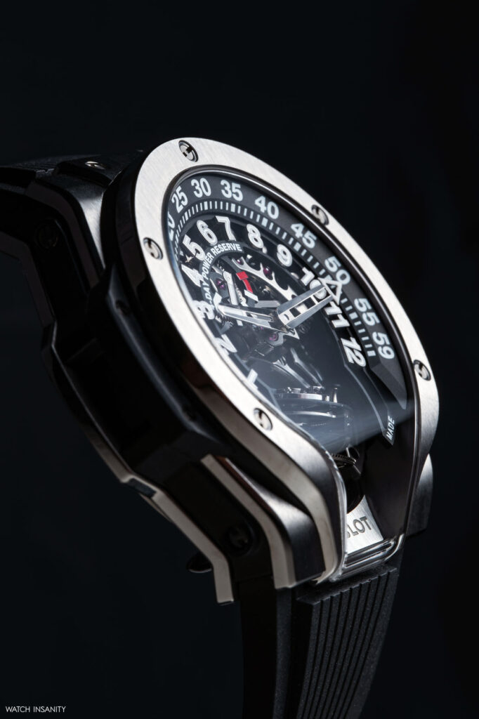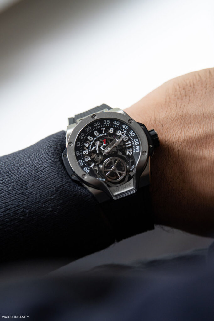 Speaking of the dial, its structure is made up of different levels. If the minute track arc is designed along the inclined rehaut, the hours one is at a slightly lower level, with the indexes resting on a black and matt skeletonized bridge, which gives the impression they are floating. Right below is the last level, with the arc and the power reserve indicator hand at 11 o’clock, and full view of the HUB6200 in-house caliber.