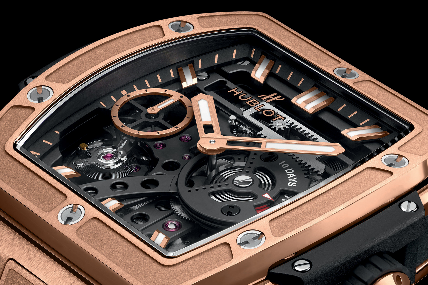 The new HUB1233 calibre retains the basic principles of the manual-winding skeleton Meca-10 factory movement, with its parallel twin barrel and exceptional 10-day power reserve displayed in an unusual way. At 12 o’clock, there are two racks sliding on a line between 9 o’clock and 3 o’clock with an innovative new rack and pinion, whilst the opening at 3 o’clock shows the number of days left on the power reserve. Another technical and aesthetic feature is also reflected in the round movement: the usual plate is replaced by bridges with a fixed length on either side of a ring that serves as a base for the movement—a highly original architecture that brings to mind the perforated “joists” of a construction set. Clever skeletonising of the components draws the eye to the heart of the mechanism, with a fascinating effect of depth, whether you look from the side of the dial or through the transparent back cover. The technical appearance of the whole is lifted by the contrast between parts made from crude steel with satin or polished finishes and parts with blackened finishes. The central display of the hours and minutes is completed by a small second hand at 9 o’clock, next to the balance and the hairspring.