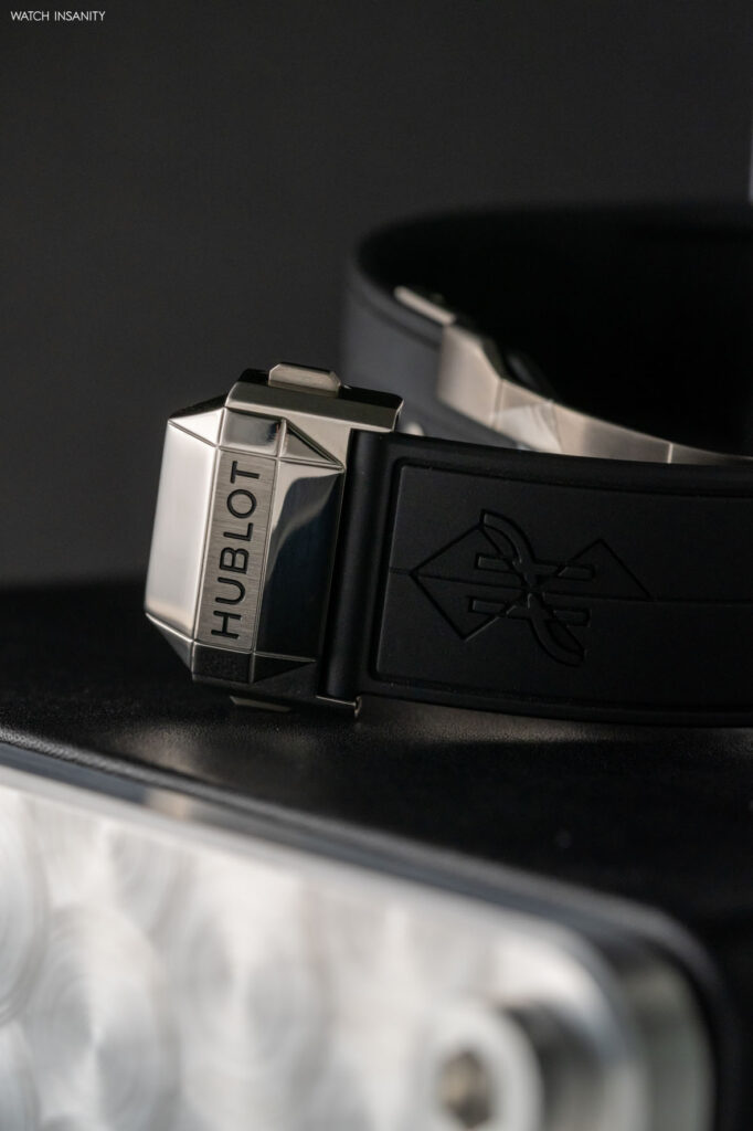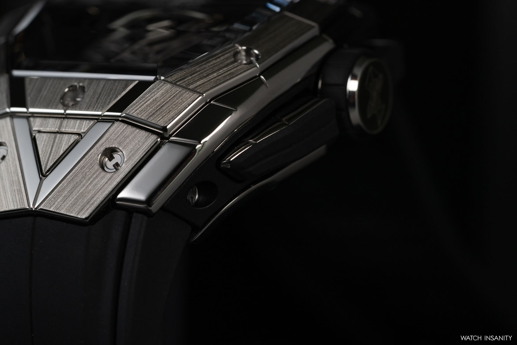 The complex and multifaceted surfaces of the case exalted its geometry, alternating polished and satin finishes. A black rubber-coated crown and rectangular chronograph pushers completed the case, waterproof up to 100 m. 100 pieces were made in King Gold and 200 in titanium.