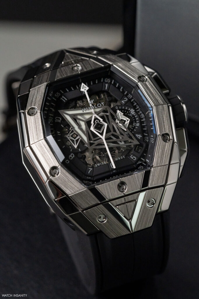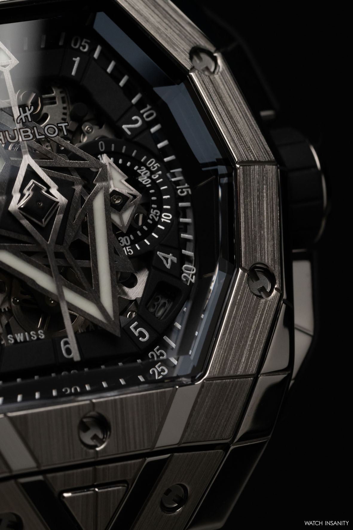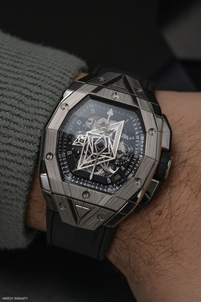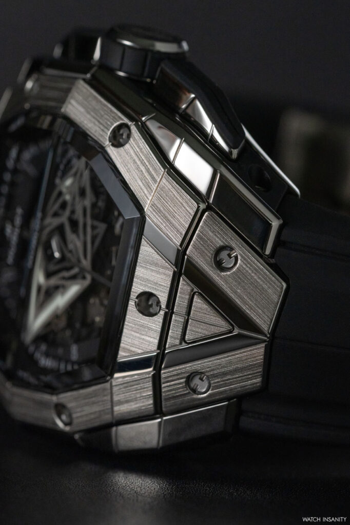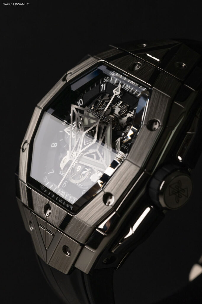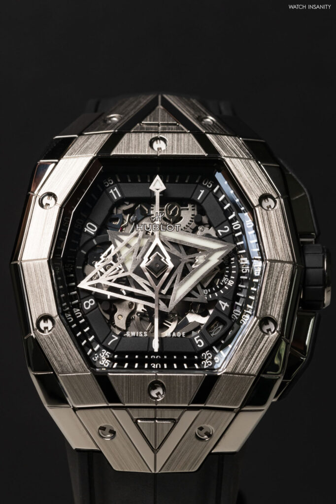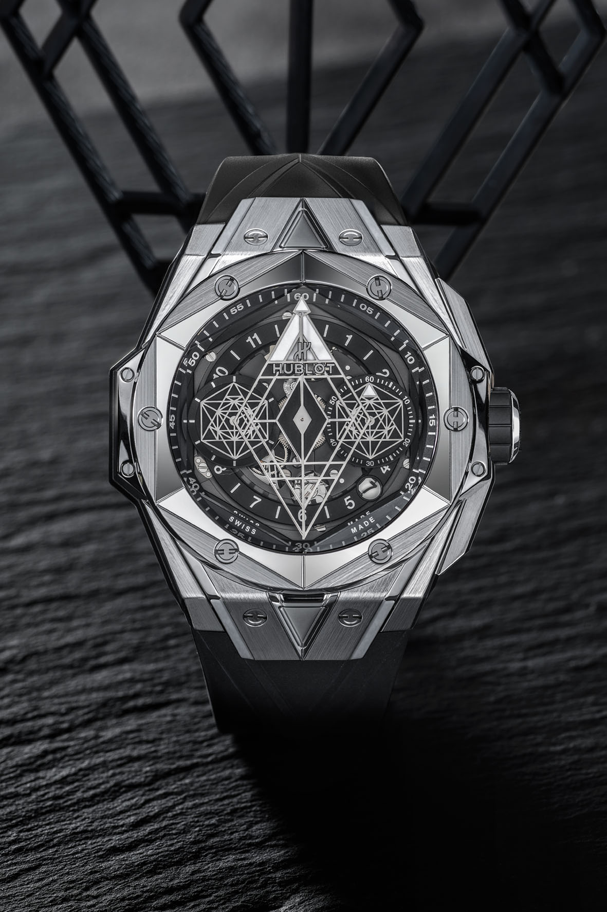 As if hexagons, diamonds and triangles explode from the dial and overlap to create new shapes and volumes throughout the watch, which becomes almost rhomboid. All by translating the lines dear to Plescia-Büchi onto a different volume – namely the Spirit of Big Bang’s tonneau shape – to offer a new point of view to look at Hublot’s creation. The alternation of polished and satin-finished surfaces on the case and the bezel further animates the timepiece.