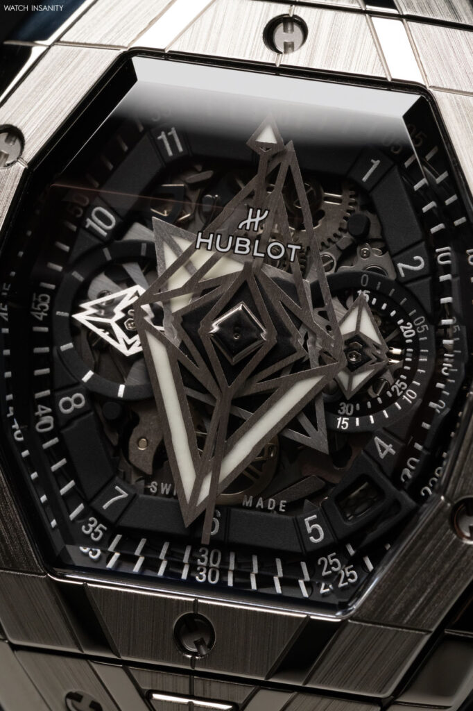 The central chronograph seconds hand (yes, the Spirit of Big Bang Sang Bleu III is a chronograph) has a luminescent arrowhead and extends across the whole diameter of the dial, pointing to a track printed on a dodecagonal sapphire crystal. Depending on the angle, this track can appear duplicated, thanks to the particular workmanship chosen by Hublot and the tattoo artist for the sapphire crystal protecting the dial.