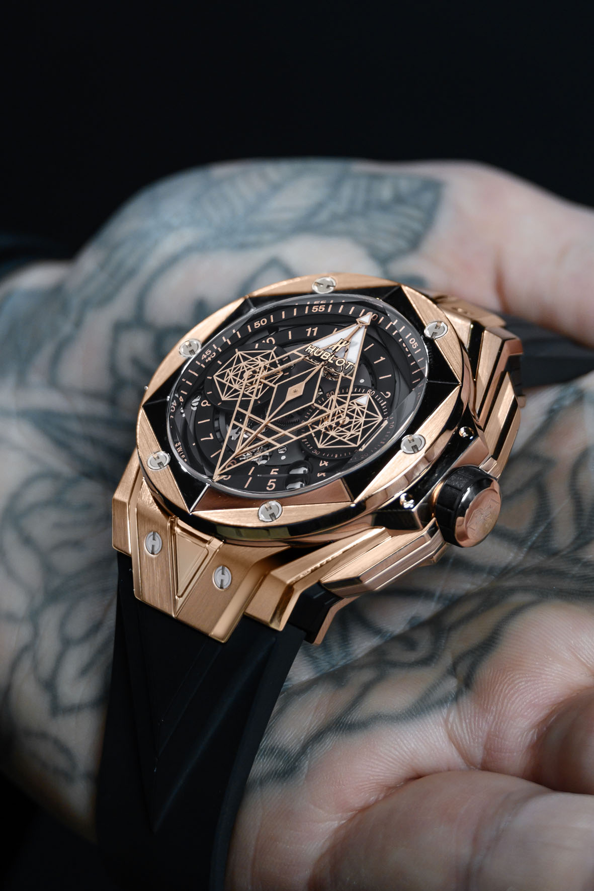 Three years later, in 2019, Hublot created the Big Bang Sang Bleu II, in which the collaboration between the artist and the brand gave life to a watch crafted as if it were a body adorned with a full-body tattoo. Indeed, the whole Big Bang was covered in it, from the case and hexagonal bezel to the sapphire crystal, hands and bracelet.